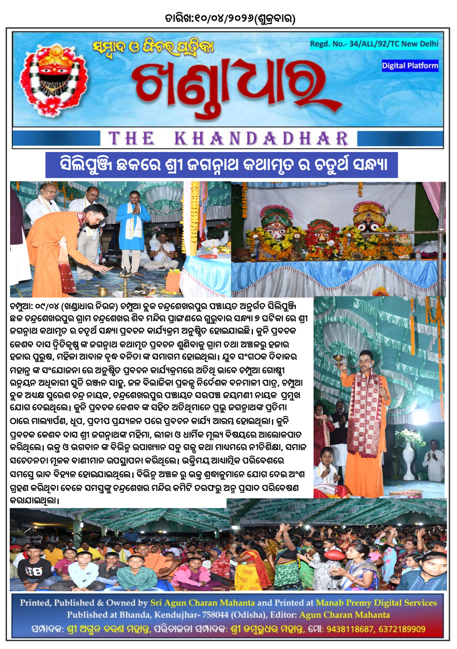 ଚମ୍ପୁଆ -୦୯/୦୪(ଖଣ୍ଡାଧାର ନିଉଜ) ଚମ୍ପୁଆ ବ୍ଲକ ଚନ୍ଦ୍ରଶେଖରପୁର ପଞ୍ଚାୟତ ଅନ୍ତର୍ଗତ ସିଲିପୁଞ୍ଜି ଛକ ଚନ୍ଦ୍ରଶେଖରପୁର ଗ୍ରାମ ଚନ୍ଦ୍ରଶେଖର ଶିବ ମନ୍ଦିର ପ୍ରାଙ୍ଗଣରେ ଗୁରୁବାର ସନ୍ଧ୍ୟା ୭ ଘଟିକା ରେ ଶ୍ରୀ ଜଗନ୍ନାଥ କଥାମୃତ ର ଚତୃର୍ଥ ସନ୍ଧ୍ୟା ପ୍ରବଚନ କାର୍ଯ୍ୟକ୍ରମ ଅନୁଷ୍ଠିତ ହୋଇଯାଇଛି l କୁନି ପ୍ରବଚକ କେଶବ ଦାସ ଦ୍ୱିତିକୃଷ୍ଣ ଙ୍କ ଜଗନ୍ନାଥ କଥାମୃତ ପ୍ରବଚନ ଶୁଣିବାକୁ ଗ୍ରାମ ତଥା ଅଞ୍ଚଳରୁ ହଜାର ହଜାର ପୁରୁଷ, ମହିଳା ଆବାଳ ବୃଦ୍ଧ ବନିତା ଙ୍କ ସମାଗମ ହୋଇଥିଲା l