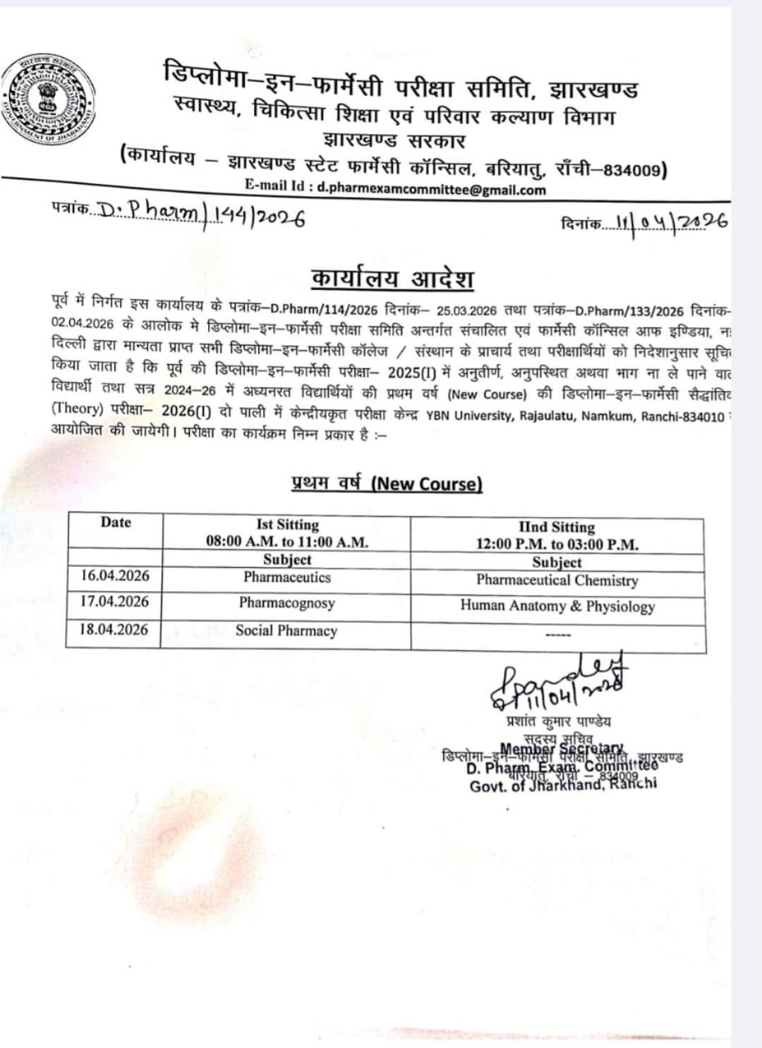 डिप्लोमा- इन -फार्मेसी कि परीक्षा जो 16 अप्रैल से शुरू होना है आज सेन्टर घोषित किया गया