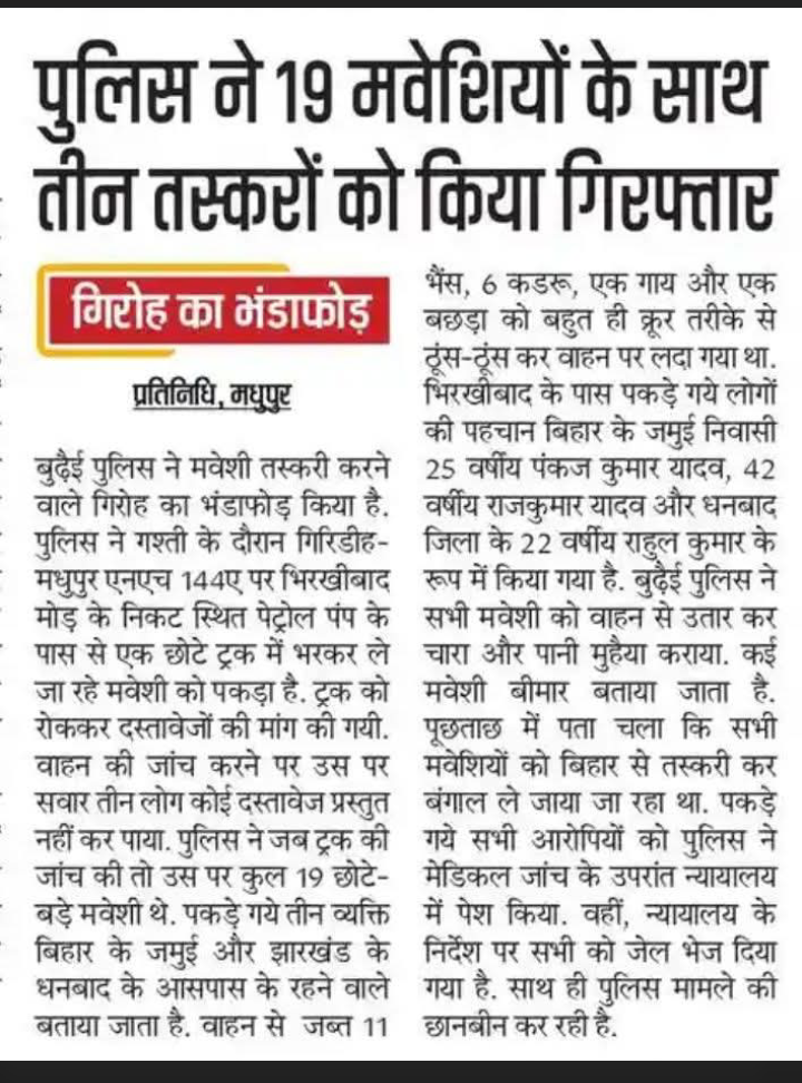 बुढ़ई (मधुपुर): पुलिस ने पशु तस्करी के खिलाफ एक सफल अभियान चलाते हुए तीन तस्करों को गिरफ्तार किया है और उनके चंगुल से 19 मवेशियों को मुक्त कराया है।