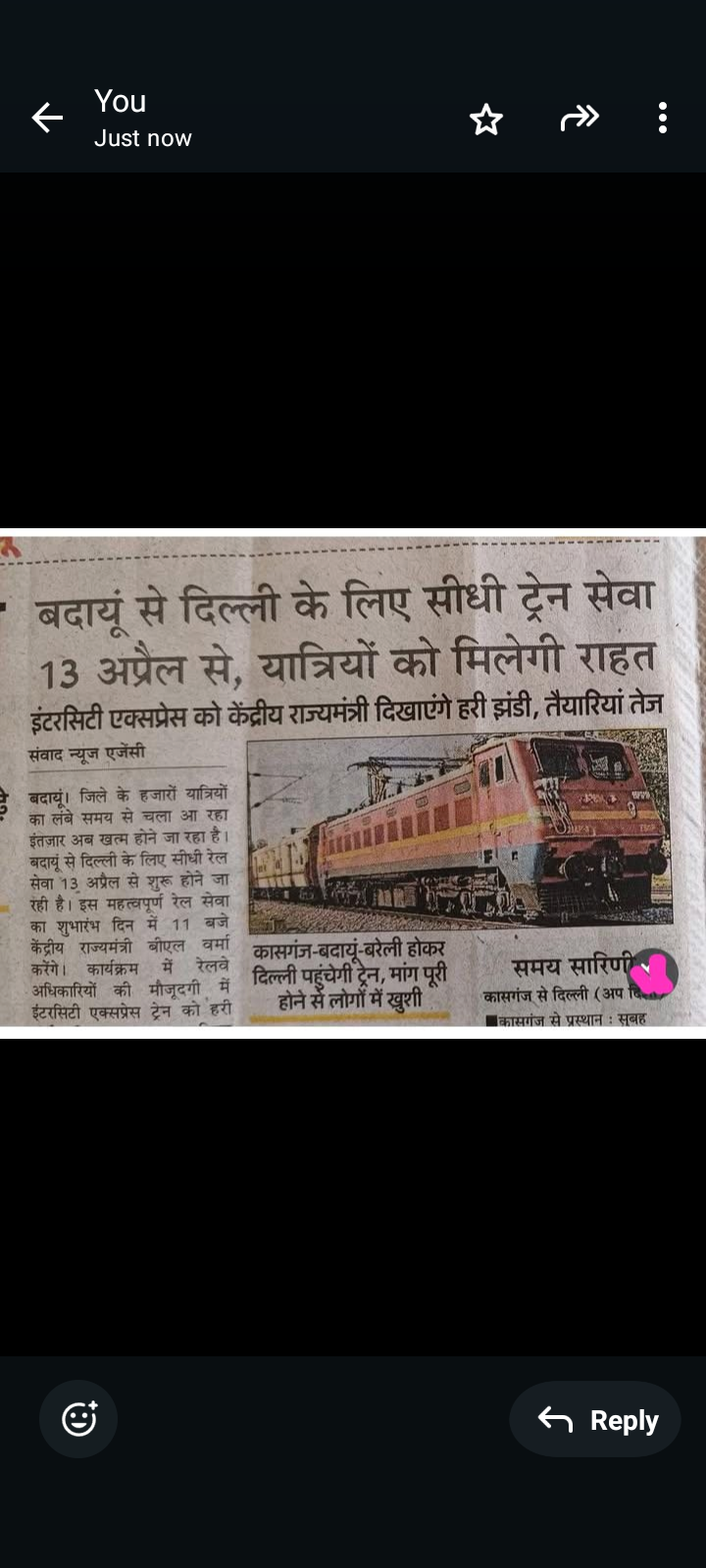 Ek bahuut achhi khabar ye h ki kasganj se soron ujhani badaun bareilly jane balo ke liye ek new train 🚃 suro gayi h jiska sanchalan 13/4/2026 se suru hoga samay 2..50 raat ko kasganj se prasthaan karegi