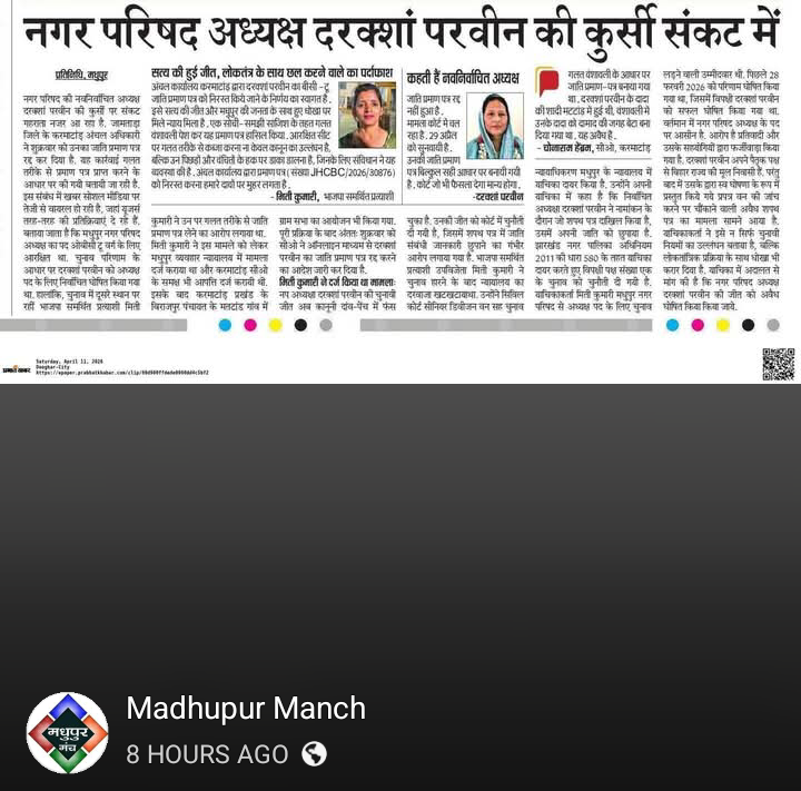 ​मधुपुर नगर परिषद की नवनिर्वाचित अध्यक्ष दरख्शां परवीन की मुश्किलें बढ़ गई हैं। जामताड़ा जिले के करमाटांड़ अंचल अधिकारी (CO) ने शुक्रवार को उनका BC-2 जाति प्रमाण पत्र रद्द कर दिया है। उन पर गलत वंशावली के आधार पर फर्जी तरीके से प्रमाण पत्र हासिल करने का आरोप लगा है।