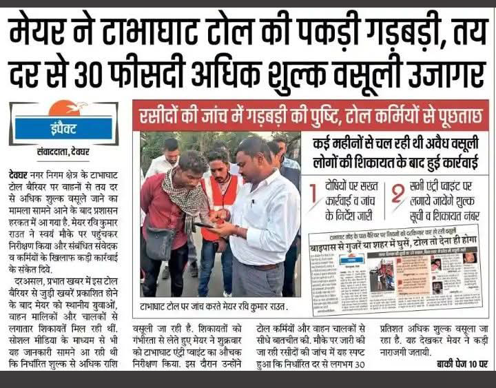 रिपोर्ट ​टाभाघाट टोल पर बड़ी लापरवाही उजागर: तय दर से 30% ज्यादा वसूली, मेयर ने की छापेमारी