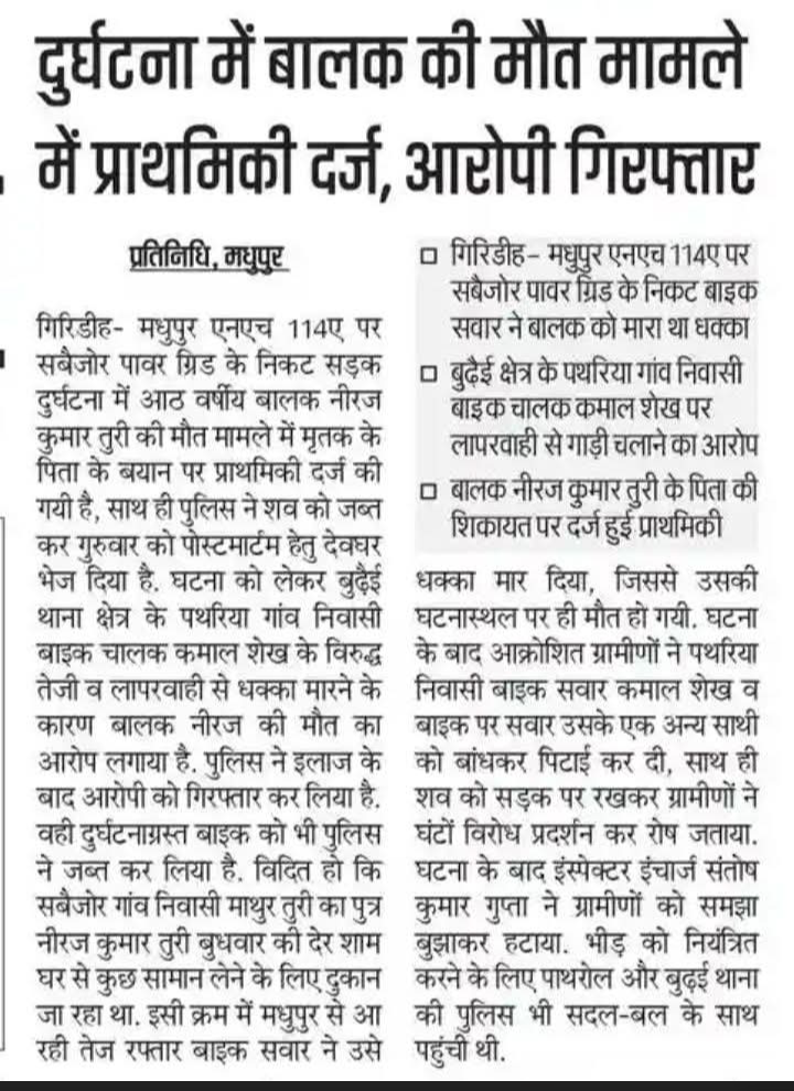 रिपोर्ट ​मधुपुर सड़क दुर्घटना: मासूम की मौत के मामले में FIR दर्ज, आरोपी गिरफ्तार