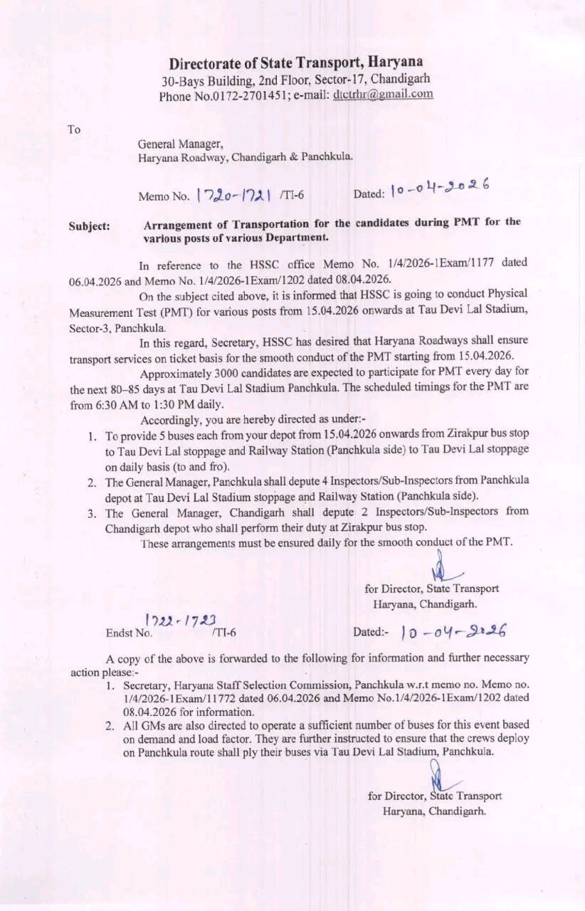 हरियाणा राज्य परिवहन विभाग ने HSSC द्वारा आयोजित PMT के लिए उम्मीदवारों की सुविधा हेतु बसों का इंतज़ाम किया है। यह टेस्ट 15 अप्रैल 2026 से ताऊ देवी लाल स्टेडियम, पंचकूला में होगा। रोज़ाना करीब 3000 अभ्यर्थी भाग लेंगे और PMT सुबह 6:30 से दोपहर 1:30 बजे तक चलेगा।