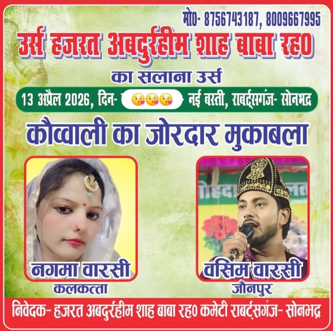 रॉबर्ट्सगंज (सोनभद्र)। नगर के नई बस्ती स्थित हजरत अब्दुर्रहीम शाह बाबा रह0 का सालाना उर्स आगामी 13 अप्रैल 2026 को अकीदत और एहतराम के साथ मनाया जाएगा। इस मौके पर उर्स कमेटी द्वारा कव्वाली के एक भव्य मुकाबले का आयोजन किया गया है।