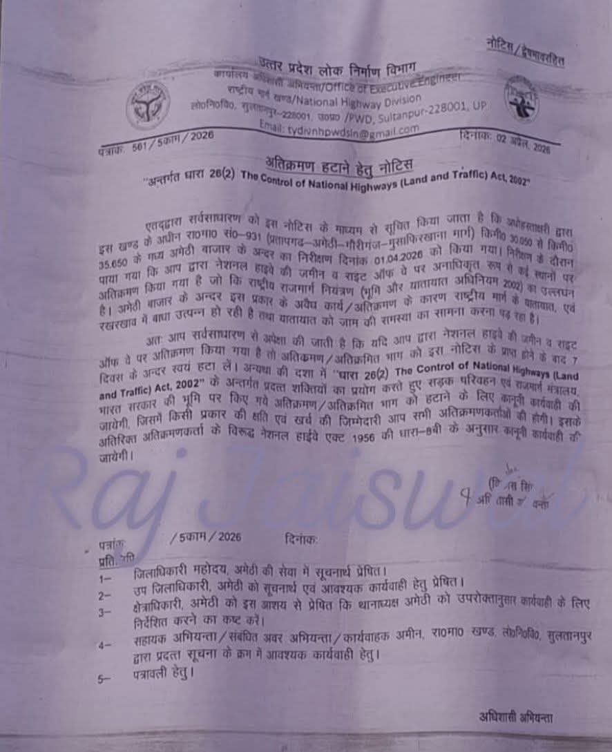 अमेठी में नेशनल हाईवे पर अतिक्रमण को लेकर प्रशासन सख्त, 7 दिन में हटाने का नोटिस जारी