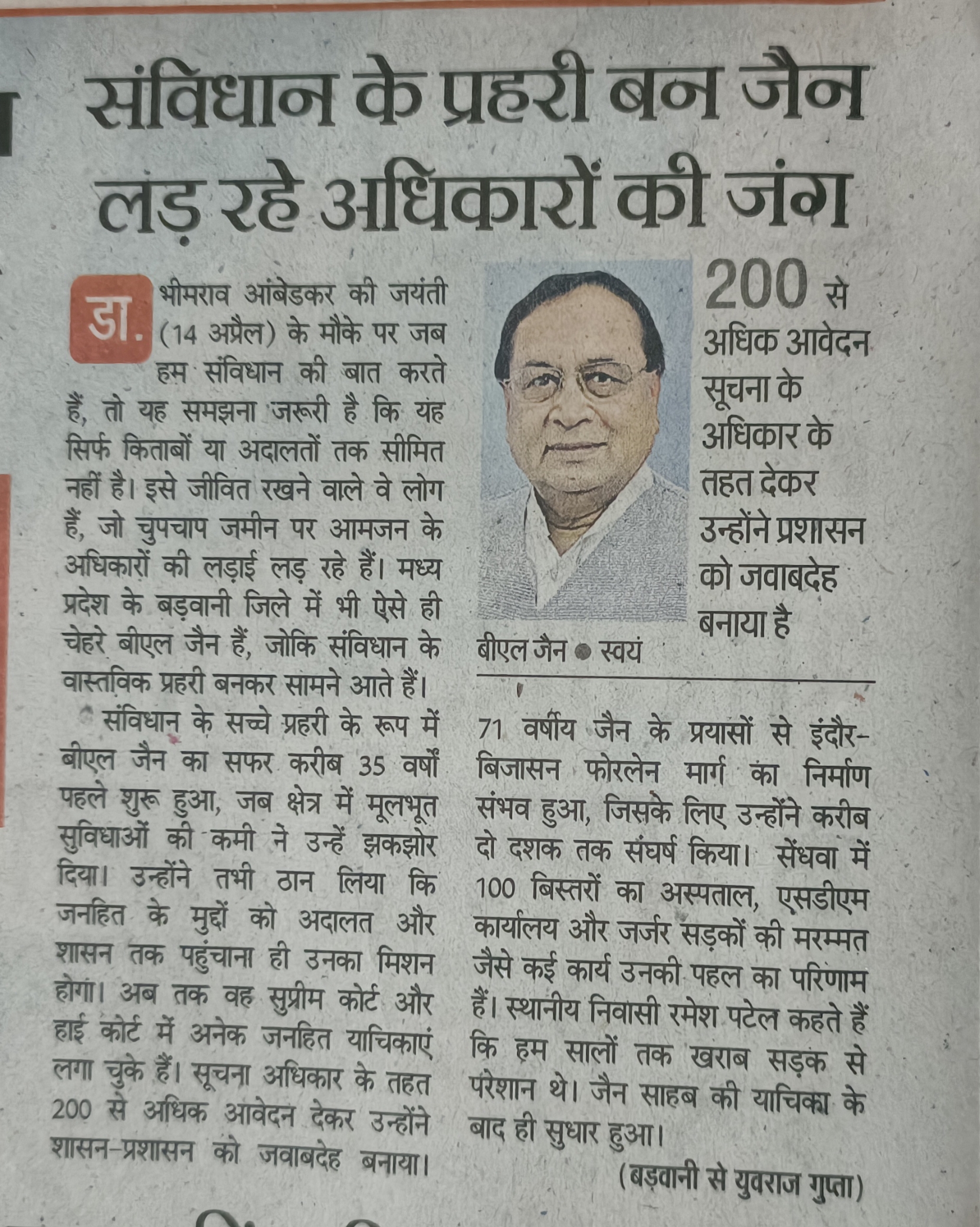 बीएल जैन संविधान के प्रहरी बन जैन लड़ रहे अधिकारियों की जंग ।