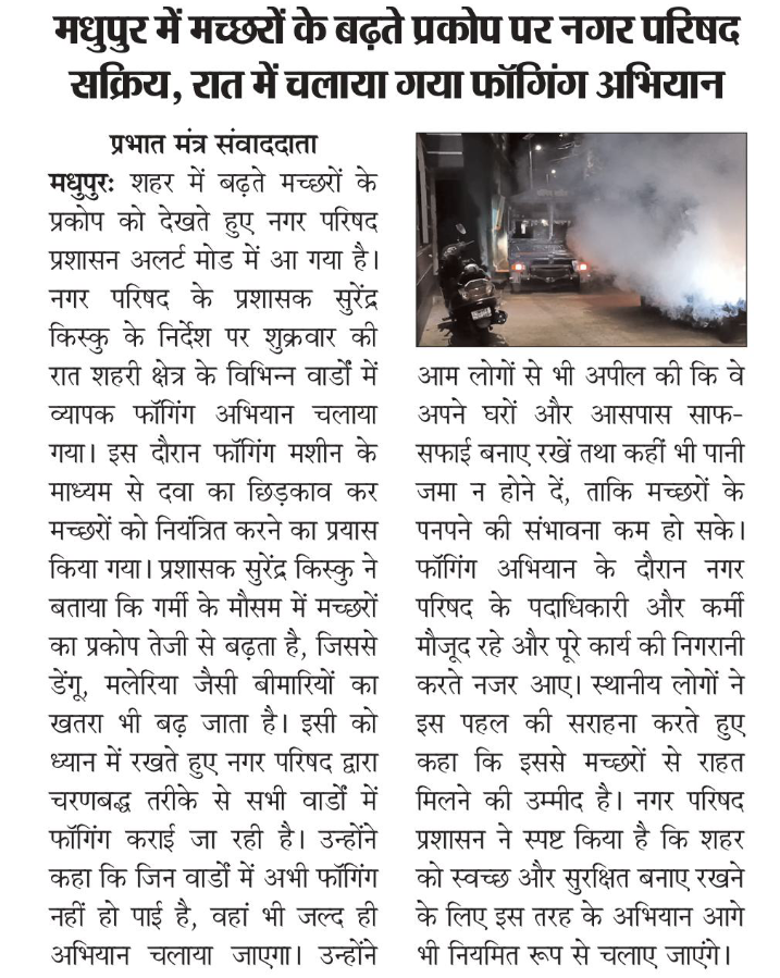​मधुपुर शहर में मच्छरों की बढ़ती संख्या और उससे होने वाली बीमारियों (जैसे डेंगू और मलेरिया) के खतरे को देखते हुए नगर परिषद प्रशासन ने फॉगिंग अभियान शुरू किया है।