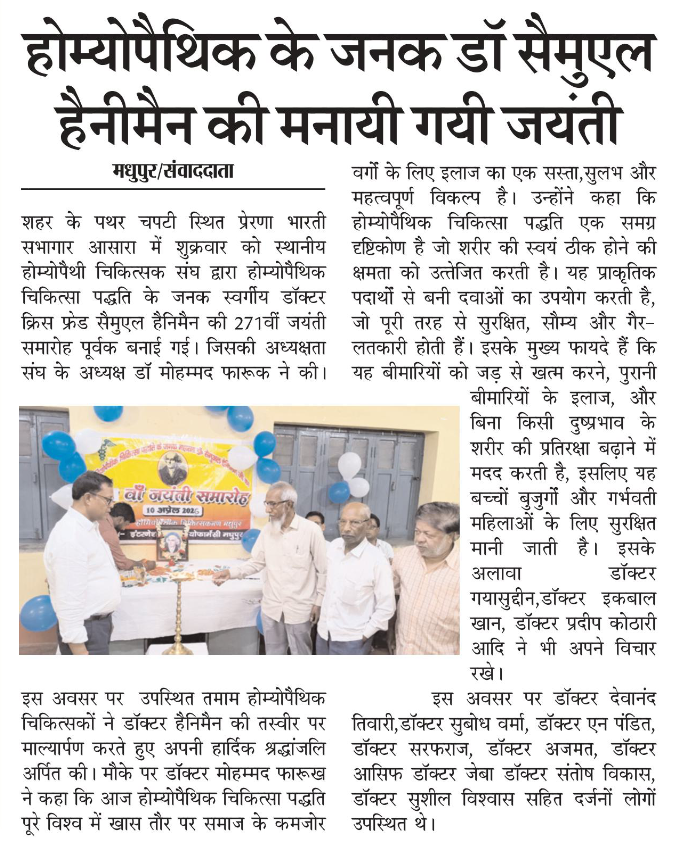 रिपोर्ट : होम्योपैथी के जनक डॉ. सैमुअल हैनीमैन की 271वीं जयंती के अवसर पर मधुपुर में एक समारोह का आयोजन