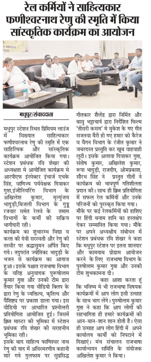 रिपोर्ट : मधुपुर स्टेशन पर प्रसिद्ध साहित्यकार फणीश्वरनाथ रेणु की स्मृति में एक सांस्कृतिक कार्यक्रम का आयोजन