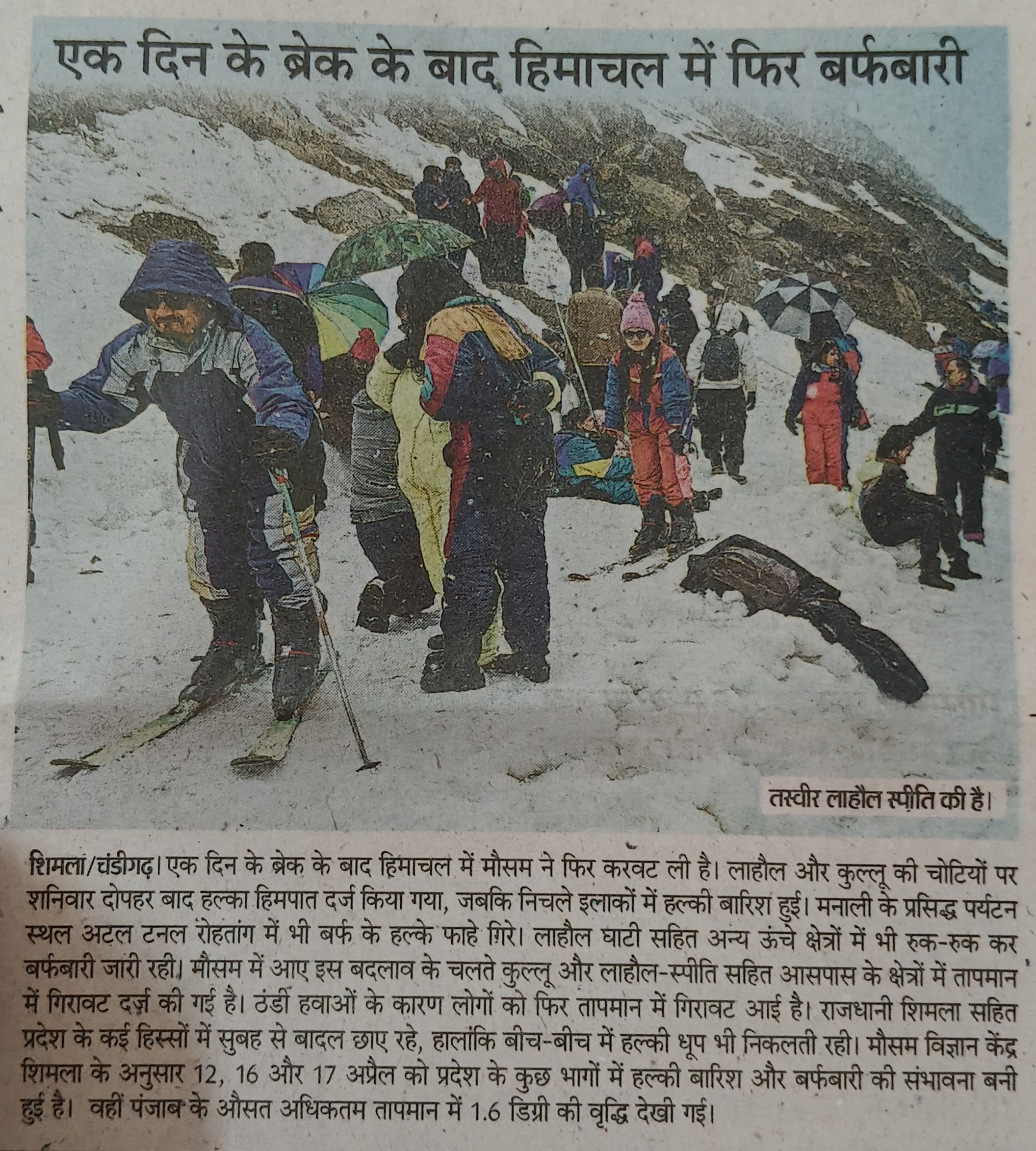 मौसम विभाग के अनुसार 12, 16 और 17 अप्रैल को हिमाचल के कुछ हिस्सों में हल्की बारिश और बर्फबारी की संभावना बनी हुई है।
