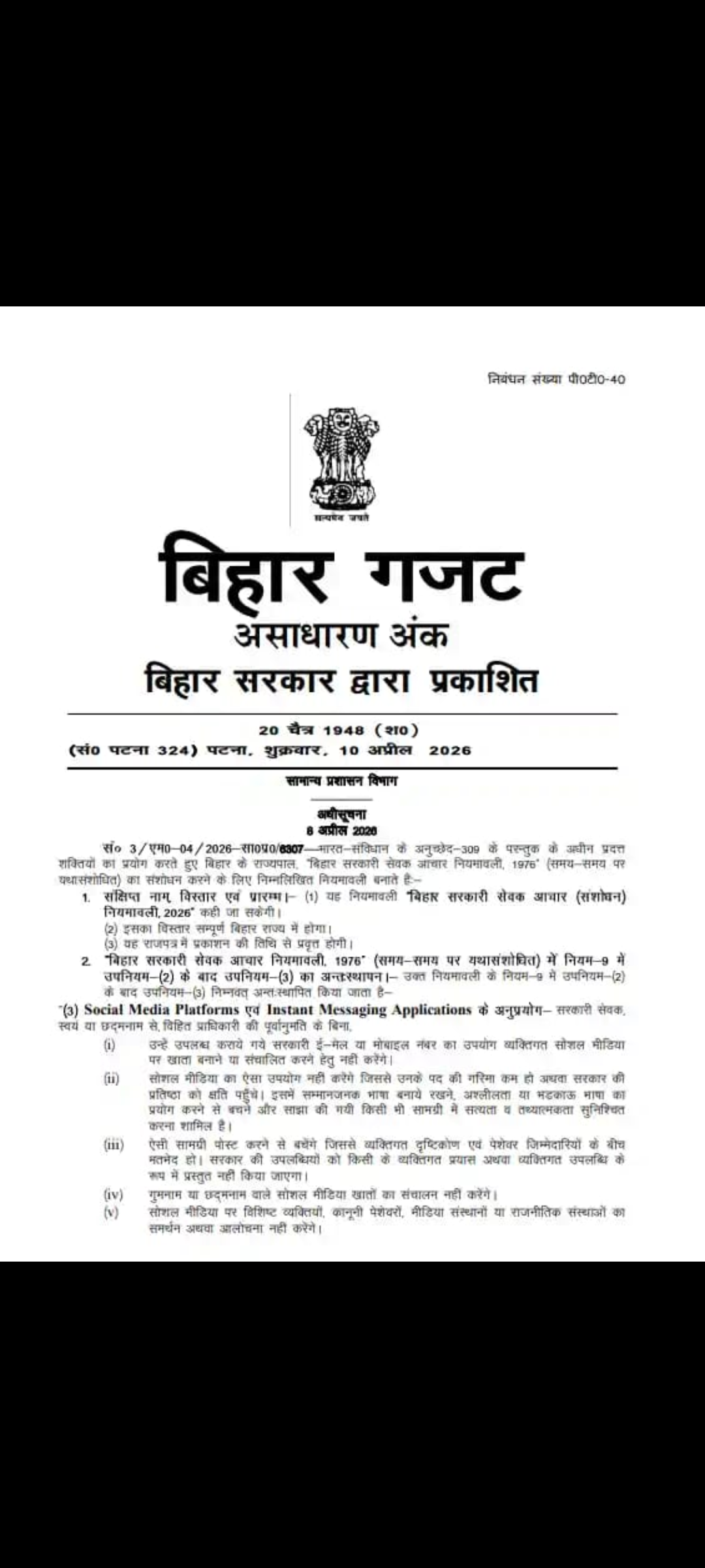 बिहार सरकारी सेवक आचार (संशोधन) नियमावली, 2026” के तहत अब कोई भी कर्मचारी बिना अनुमति सोशल मीडिया पर सरकार की नीतियों, योजनाओं या अदालत के फैसलों पर अपनी निजी राय नहीं दे सकेगा. ऐसा करने पर इसे सीधे अपराध माना जाएगा.
