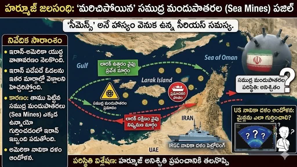 ఇరాన్-అమెరికా యుద్ధం మొదలైనప్పటినుంచీ టాక్ ఆఫ్ ది టాపిక్ గా ప్రతిరోజూ, ప్రతిక్షణం ప్రపంచ వ్యాప్తంగా పెద్ద హాట్ న్యూస్ గా మారిన హర్మూజ్ మరోసారి తెరపైకి వచ్చింది. ఆ మార్గంలో రాకండి, వేరే మార్గాల్లో వెళ్లండి అంటూ ఇరాన్ పదేపదే చెప్తుండటానికి కారణం ఏమిటో ఇప్పుడు వెలుగులోకి వచ్చింది. హర్మూజ్ జలసంధిలోకి చొరబాట్లను నిలువరించేందుకు తాము పెట్టిన సీమైన్స్..ఎక్కడెక్కడ