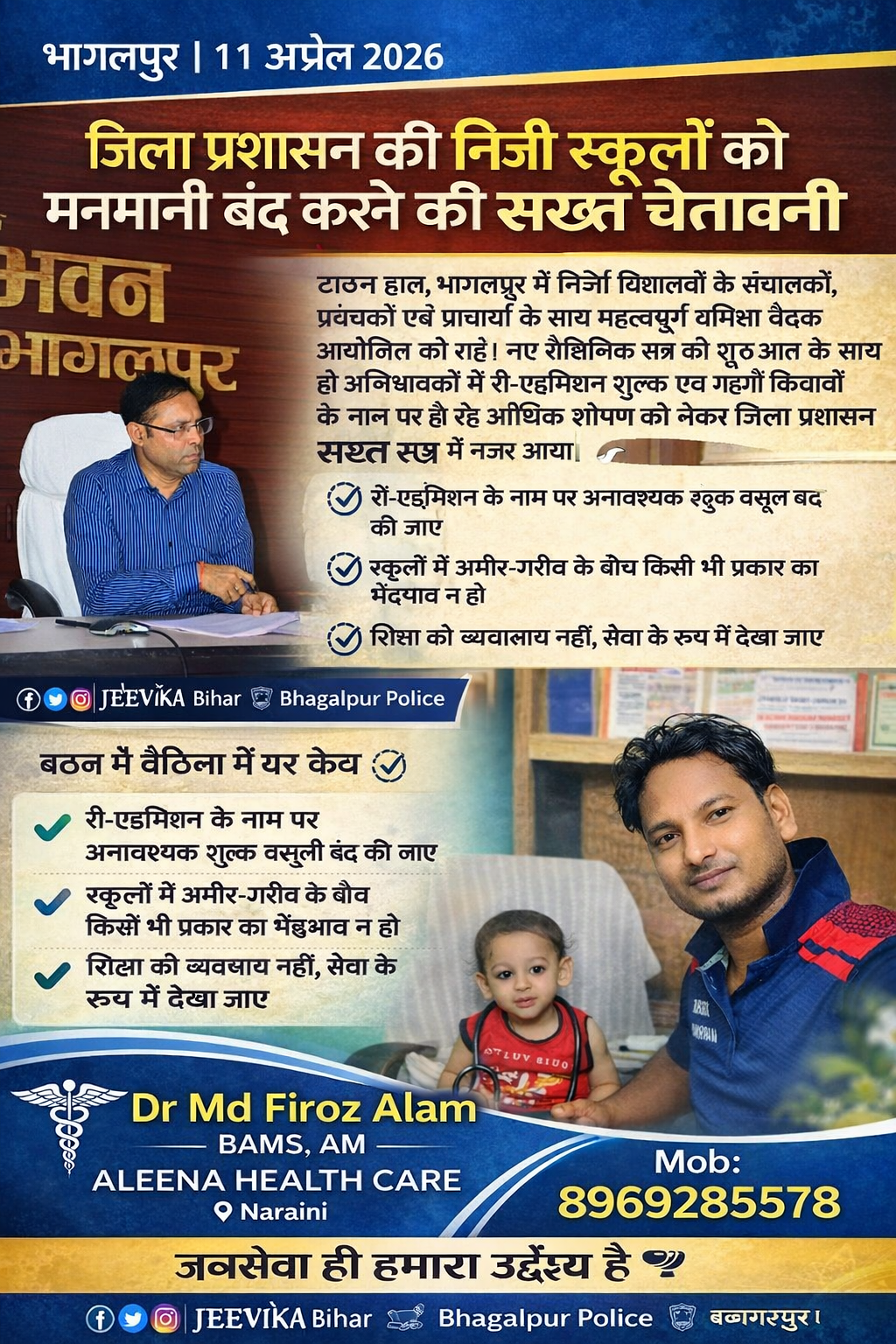 जिलाधिकारी Dr. Nawal Kishor Choudhary ने स्पष्ट निर्देश दिया कि अब स्कूलों की मनमानी बिल्कुल भी बर्दाश्त नहीं की जाएगी। यदि कोई भी संस्थान सरकारी निर्देशों की अनदेखी करता है, तो उसके खिलाफ कड़ी प्रशासनिक कार्रवाई की जाएगी।