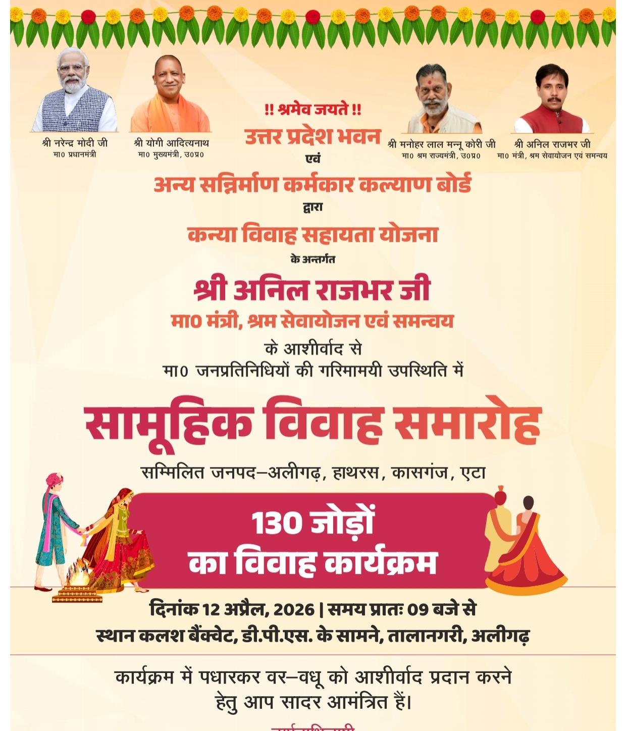 उक्त कार्यक्रम में अलीगढ़ मंडल के जनपद अलीगढ़, हाथरस, कासगंज एवं एटा के कुल 130 जोड़ों का विवाह संपन्न कराया जाएगा। इस अवसर पर जनप्रतिनिधियों की गरिमामयी उपस्थिति में वर-वधुओं को आशीर्वाद प्रदान किया जाएगा।