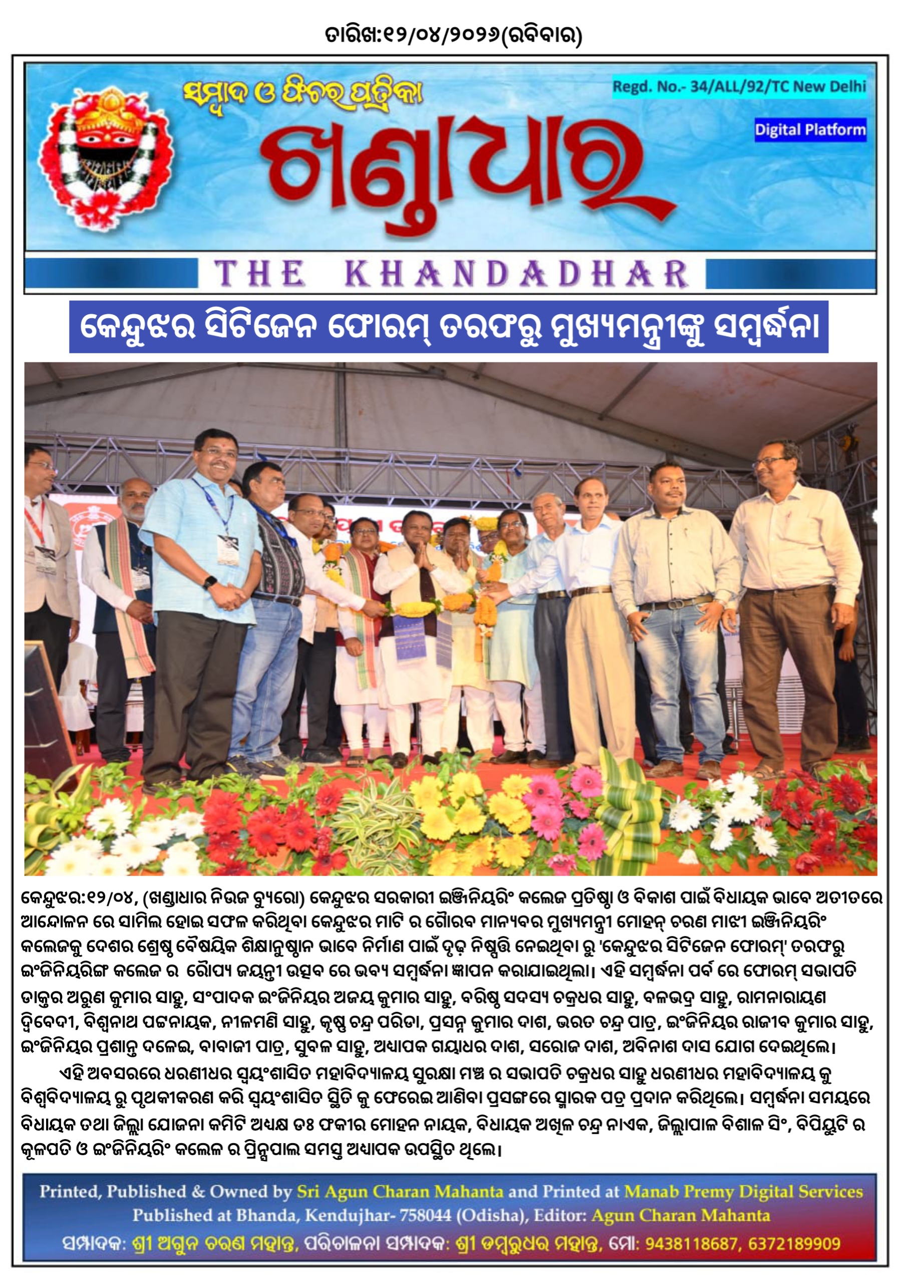 କେନ୍ଦୁଝର:୧୨/୦୪ (ଖଣ୍ଡାଧାର ନିଉଜ ବ୍ୟୁରୋ) କେନ୍ଦୁଝର ସରକାରୀ ଇଞ୍ଜିନିୟରିଂ କଲେଜ ପ୍ରତିଷ୍ଠା ଓ ବିକାଶ ପାଇଁ ବିଧାୟକ ଭାବେ ଅତୀତରେ ଆନ୍ଦୋଳନ ରେ ସାମିଲ ହୋଇ ସଫଳ କରିଥିବା କେନ୍ଦୁଝର ମାଟି ର ଗୋୖରବ ମାନ୍ୟବର ମୁଖ୍ୟମନ୍ତ୍ରୀ ମୋହନ୍ ଚରଣ ମାଝୀ ଇଞ୍ଜିନିୟରିଂ କଲେଜକୁ ଦେଶର ଶ୍ରେଷ୍ଠ ବୈଷୟିକ ଶିକ୍ଷାନୁଷ୍ଠାନ ଭାବେ ନିର୍ମାଣ ପାଇଁ ଦୃଢ଼ ନିଷ୍ପତ୍ତି ନେଇଥିବା ରୁ 'କେନ୍ଦୁଝର ସିଟିଜେନ ଫୋରମ୍' ତରଫରୁ ଇଂଜିନିୟରିଙ୍ଗ କଲେଜ ର ରୋୖପ୍ୟ ଜୟନ୍ତୀ ଉତ୍ସବ ରେ ଭବ୍ୟ ସମ୍ବର୍ଦ୍ଧନା ଜ୍ଞାପନ କରାଯାଇଥିଲା। ଏହି ସମ୍ବର୍ଦ୍ଧନା ପର୍ବ ରେ ଫୋରମ୍ ସଭାପତି ଡାକ୍ତର ଅରୁଣ କୁମାର ସାହୁ, ସଂପାଦକ ଇଂଜିନିୟର ଅଜୟ କୁମାର ସାହୁ, ବରିଷ୍ଠ ସଦସ୍ୟ ଚକ୍ରଧର ସାହୁ, ବଳଭଦ୍ର ସାହୁ, ରାମନାରାୟଣ ଦ୍ୱିବେଦୀ, ବିଶ୍ୱନାଥ ପଟ୍ଟନାୟକ, ନୀଳମଣି ସାହୁ, କୃଷ୍ଣ ଚନ୍ଦ୍ର ପରିଡା, ପ୍ରସନ୍ନ କୁମାର ଦାଶ,ଭରତ ଚନ୍ଦ୍ର ପାତ୍ର, ଇଂଜିନିୟର ରାଜୀବ କୁମାର ସାହୁ, ଇଂଜିନିୟର ପ୍ରଶାନ୍ତ ଦଳେଇ, ବାବାଜୀ ପାତ୍ର, ସୁବଳ ସାହୁ, ଅଧ୍ୟାପକ ଗୟାଧର ଦାଶ, ସରୋଜ ଦାଶ, ଅବିନାଶ ଦାସ
