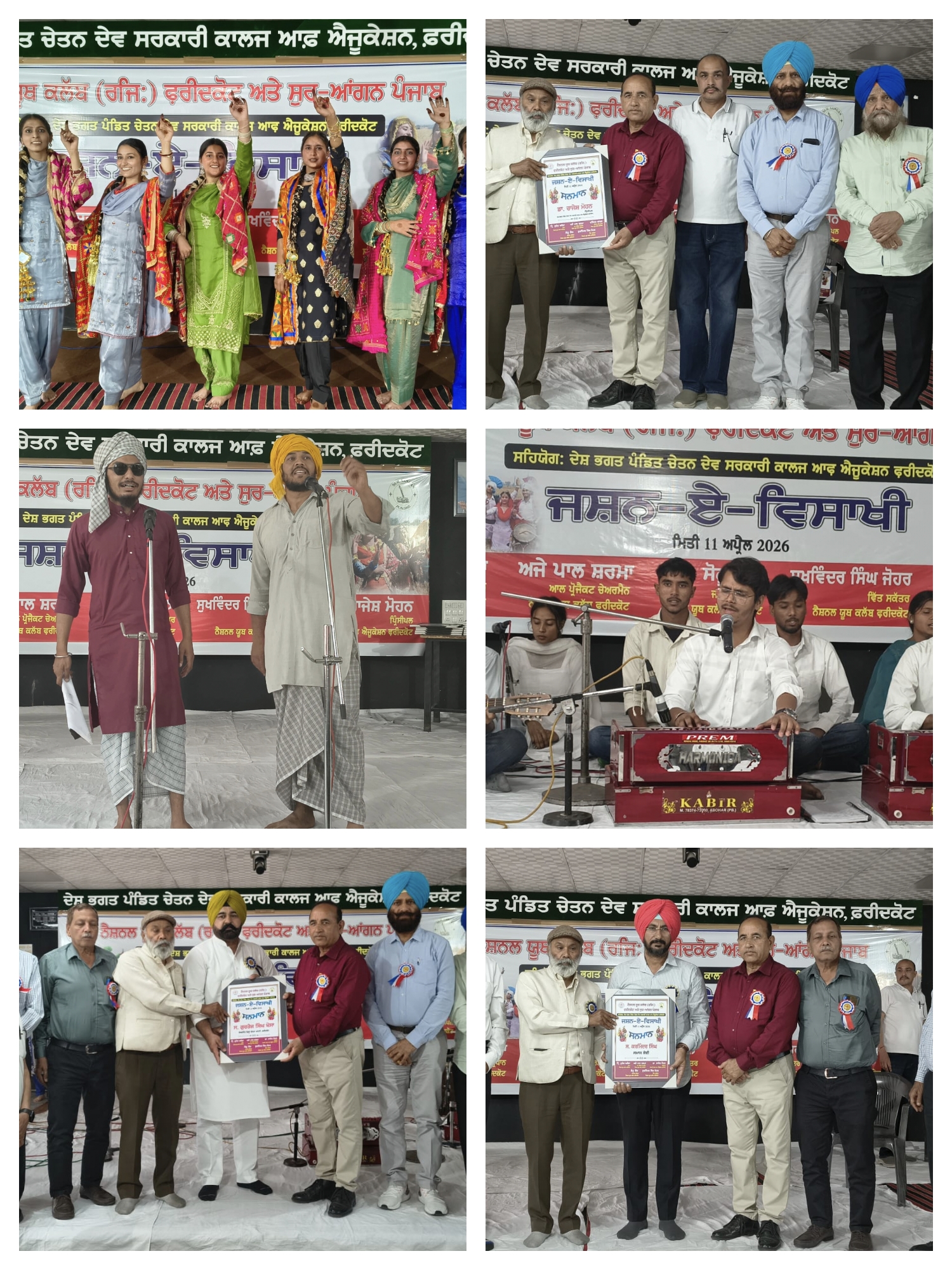 ਅਤੇ ਸੁਰ ਆਂਗਨ ਪੰਜਾਬ ਵੱਲੋਂ ਦੇਸ਼ ਭਗਤ ਪੰਡਿਤ ਚੇਤਨ ਦੇਵ ਸਰਕਾਰੀ ਕਾਲਜ ਆਫ ਐਜੂਕੇਸ਼ਨ ਫਰੀਦਕੋਟ ਦੇ ਸਹਿਯੋਗ ਨਾਲ ਦੇਸ਼ ਭਗਤ ਪੰਡਿਤ ਚੇਤਨ ਦੇਵ ਸਰਕਾਰੀ ਕਾਲਜ ਆਫ ਐਜੂਕੇਸ਼ਨ ਫਰੀਦਕੋਟ ਵਿਖੇ ਪ੍ਰੋਗਰਾਮ ਜਸ਼ਨ - ਏ - ਵਿਸਾਖੀ ਕਲੱਬ ਦੇ ਪ੍ਰਧਾਨ ਪ੍ਰਿੰ:ਸੁਰੇਸ਼ ਅਰੋੜਾ ਦੀ ਯੋਗ ਅਗਵਾਈ ਅਤੇ ਸਰਕਾਰੀ ਕਾਲਜ ਆਫ ਐਜੂਕੇਸ਼ਨ ਫਰੀਦਕੋਟ ਡਾ:ਰਾਜੇਸ਼ ਮੋਹਨ ਜੀ ਦੀ ਸਰਪ੍ਰਸਤੀ ਹੇਠ ਕਰਵਾਇਆ ਗਿਆ।ਕਲੱਬ ਦੇ ਸਮੂਹ ਮੈਂਬਰਾਂ ਨੇ ਮੁੱਖ ਮਹਿਮਾਨ ਅਤੇ ਵਿਸ਼ੇਸ਼ ਮਹਿਮਾਨਾਂ ਦਾ ਫੁੱਲਾਂ ਦੇ ਹਾਰ ਪਾ ਕੇ ਨਿੱਘਾ ਸਵਾਗਤ ਕੀਤਾ।ਸਮਾਗਮ ਦੇ ਮੁੱਖ ਮਹਿਮਾਨ ਸ ਗੁਰਤੇਜ ਸਿੰਘ ਖੋਸਾ ਚੇਅਰਮੈਨ ਜ਼ਿਲ੍ਹਾ ਯੋਜਨਾ ਕਮੇਟੀ ਫਰੀਦਕੋਟ ਸਨ ਜਦ ਕਿ ਪ੍ਰਧਾਨਗੀ ਸੀਨੀਅਰ ਐਡਵੋਕੇਟ ਸ਼੍ਰੀ ਰਾਜ ਕੁਮਾਰ ਗੁਪਤਾ ਨੇ ਕੀਤੀ ਪ੍ਰੋਗਰਾਮ ਦਾ ਉਦਘਾਟਨ ਸ਼੍ਰੀ ਪਿਯੂਸ਼ ਬਾਂਸਲ ਸਮਾਜ ਸੇਵੀ ਨੇ ਰੀਬਨ ਕੱਟ ਕੇ ਕੀਤਾ।ਵਿਸ਼ੇਸ਼ ਮਹਿਮਾਨਾ ਵਿੱਚ ਸ ਕਰਮਿੰਦਰ ਦੇ ਬਿੱਟੂ ਗਿੱਲ,ਐਡਵੋਕੇਟ ਨਾਇਬ ਸਿੰਘ ਸੰਘਾ,ਗੁਰਮੀਤ ਸਿੰਘ ਜਟਾਨਾ ਮੋਗਾ,ਵਿਸ਼ਾਲ ਬਾਂਸਲ ਅਤੇ ਵਿਜੇ ਕੁਮਾਰ ਛਾਬੜਾ ਸ਼ਾਮਿਲ ਸਨ। ਸੱਭ ਤੋਂ ਪਹਿਲਾਂ ਡਾ: ਰਾਜੇਸ਼ ਮੋਹਨ ਪ੍ਰਿੰਸੀਪਲ ਸਰਕਾਰੀ ਕਾਲਜ ਆਫ ਐਜੂਕੇਸ਼ਨ ਫਰੀਦਕੋਟ ਨੇ ਸਭਨਾ ਨੂੰ ਜੀ ਆਇਆਂ ਨੂੰ ਕਿਹਾ ਗਿਆ। ਨੈਸ਼ਨਲ ਯੂਥ ਕਲੱਬ ਦੇ ਪ੍ਰਧਾਨ ਪ੍ਰਿੰ: ਸੁਰੇਸ਼ ਅਰੋੜਾ ਨੇ ਕਲੱਬ ਦੀਆਂ ਗਤੀਵਿਧੀਆਂ ਤੇ ਚਾਨਣਾ ਪਾਇਆ ਅਤੇ ਕਿਹਾ ਕਿ ਕਲੱਬ ਵੱਲੋ ਚਲਾਏ ਜਾ ਰਹੇ ਮ੍ਰਿਤਕ ਦੇਹ ਸੰਭਾਲ ਕੇਂਦਰ ਲਈ ਸੋਲਰ ਸਿਸਟਮ ਦੀ ਸਖ਼ਤ ਜਰੂਰਤ ਹੈ ਜਿਸ ਤੇ ਸ ਗੁਰਤੇਜ ਸਿੰਘ ਖੋਸਾ ਨੇ ਸੋਲਰ ਸਿਸਟਮ ਲਈ ਗਰਾਂਟ ਦੇਣ ਦਾ ਐਲਾਨ ਕੀਤਾ ਤੇ ਕਲੱਬ ਮੈਂਬਰਾਂ ਨੇ ਸ ਗੁਰਤੇਜ ਸਿੰਘ ਖੋਸਾ ਦਾ ਧੰਨਵਾਦ ਕੀਤਾ। ਸ ਗੁਰਤੇਜ ਸਿੰਘ ਖੋਸਾ ਨੇ ਕਲੱਬ ਦੀਆਂ ਗਤੀਵਿਧੀਆਂ ਦੀ ਭਰਪੂਰ ਸ਼ਲਾਘਾ ਕਰਦਿਆਂ ਕਿਹਾ ਕਿ ਇਸ ਤਰਾਂ ਦੇ ਸਮਾਗਮ ਸਾਨੂੰ ਵੱਧ ਤੋਂ ਵੱਧ ਕਰਨੇ ਚਾਹੀਦੇ ਹਨ। ਸ਼ਹਿਰ ਦੀ ਸਫਾਈ ਵੱਲ ਵਿਸ਼ੇਸ਼ ਧਿਆਨ ਦੇਣ ਦੀ ਅਪੀਲ ਕੀਤੀ ਅਤੇ ਕਿਹਾ ਕਿ ਅੱਜ ਦੇ ਪ੍ਰੋਗਰਾਮ ਤੋਂ ਸਾਨੂੰ ਬਹੁਤ ਕੁਝ ਸਿੱਖਣ ਨੂੰ ਮਿਲਿਆ। ਸ ਜਸਬੀਰ ਸਿੰਘ ਜੱਸੀ ਜ਼ਿਲਾ ਗਈਡੇਸ ਕੌਂਸਲਰ ਨੇ ਵਿਸਾਖੀ ਦੇ ਦਿਹਾੜੇ ਤੇ ਵਿਸਥਾਰਪੂਰਵਕ ਚਾਨਣਾ ਪਾਇਆ।ਰਾਜ ਕੁਮਾਰ ਗੁਪਤਾ ਨੇ ਆਪਣੇ ਪ੍ਰਧਾਨਗੀ ਭਾਸ਼ਣ ਵਿੱਚ ਕਿਹਾ ਨੇ ਸਾਨੂੰ ਆਪਸੀ ਭਾਈ ਚਾਰਾ ਬਣਾਈ ਰੱਖਣ ਲਈ ਇਸ ਤਰਾਂ ਦੇ ਸਮਾਗਮ ਬਹੁਤ ਜਿਆਦਾ ਸਹਾਈ ਹੁੰਦੇ ਹਨ।ਦੇਸ਼ ਭਗਤ ਪੰਡਿਤ ਚੇਤਨ ਦੇਵ ਸਰਕਾਰੀ ਕਾਲਜ ਆਫ ਐਜੂਕੇਸ਼ਨ ਫਰੀਦਕੋਟ ਦੇ ਵਿੱਦਿਆਰਥੀਆਂ ਨੇ ਖੂਬ ਰੰਗ ਬੰਨ੍ਹਿਆ ਗੀਤ ਪੇਸ਼ ਕੀਤੇ ਕਵਿਤਾਵਾਂ ਪੇਸ਼ ਕੀਤੀਆਂ,ਪੰਜਾਬੀ ਭਾਸ਼ਾ ਅਤੇ ਪੰਜਾਬੀ ਸੱਭਿਆਚਾਰ ਤੋਂ ਹੋ ਰਹੇ ਮੋਹ ਭੰਗ ਤੇ ਅਧਾਰਿਤ ਸਕਿਟ ਪੇਸ਼ ਕਰਕੇ ਢਿੱਡੀ ਪੀੜਾਂ ਪਾ ਦਿੱਤੀਆਂ। ਵਿਦਿਆਰਥੀਆਂ ਨੇ ਭੰਡਾਂ ਦੀ ਆਈਟਮ ਪੇਸ਼ ਕੀਤੀ।ਕਾਲਜ ਦੇ ਪੁਰਾਣੀ ਵਿਦਿਆਰਥੀ ਸ ਵਿਸ਼ਵਜੀਤ ਸਿੰਘ ਡੇਜ਼ੀ ਨੇ ਵੀ ਆਪਣੀ ਪੇਸ਼ਕਾਰੀ ਦਿੱਤੀ। ਨਰ ਸਿੰਘ ਨੇ ਵੀ ਗੀਤ ਪੇਸ਼ ਕਰਕੇ ਆਪਣੀ ਹਾਜ਼ਰੀ ਲਗਵਾਈ।ਸੁਰ ਆਂਗਨ ਪੰਜਾਬ ਗਰੁੱਪ ਦੇ ਕਲਾਕਾਰਾਂ ਗਗਨ ਨੇ ਗੀਤ ਮੋਰਾ,ਮਾਧਵ ਅਰੋੜਾ ਅਤੇ ਲਖਵਿਰਨੇ ਸੂਫ਼ੀਆਨਾ ਗੀਤ ਪੇਸ਼ ਕੀਤੇ,ਹਰਸ਼ ਚਰਨ ਨੇ ਗੀਤ ਮਾਏ ਨੀਂ ਮੇਰੀ ਸੋਚ ਨੂੰ ਲੱਗਿਆ ਰੋਗ , ਸੰਦੀਪ ਸਿੰਘ ਸੰਗੀਤ ਅਧਿਆਪਕ ਆਗਿਆ ਪਾਲ ਨੇ ਕੁਝ ਰੁੱਖ ਮੈਨੂੰ ਪੁੱਤ ਲੱਗਦੇ ਨੇ ,ਕਰਨ ਨੇ ਮਾਹੀਆ,ਗਗਨ ਕੌਰ ਨੇ ਇੱਕ ਮੇਰੀ ਅੱਖ ਕਾਸ਼ਨੀ ਅਤੇ ਮਿਰਜ਼ਾ ਪੇਸ਼ ਕਰਕੇ ਬਹੁਤ ਵਾਹ ਵਾਹ ਖੱਟੀ ਤੇ ਇਸ ਗਰੁੱਪ ਨੇ ਗੁਲਦਸਤਾ ਪੇ