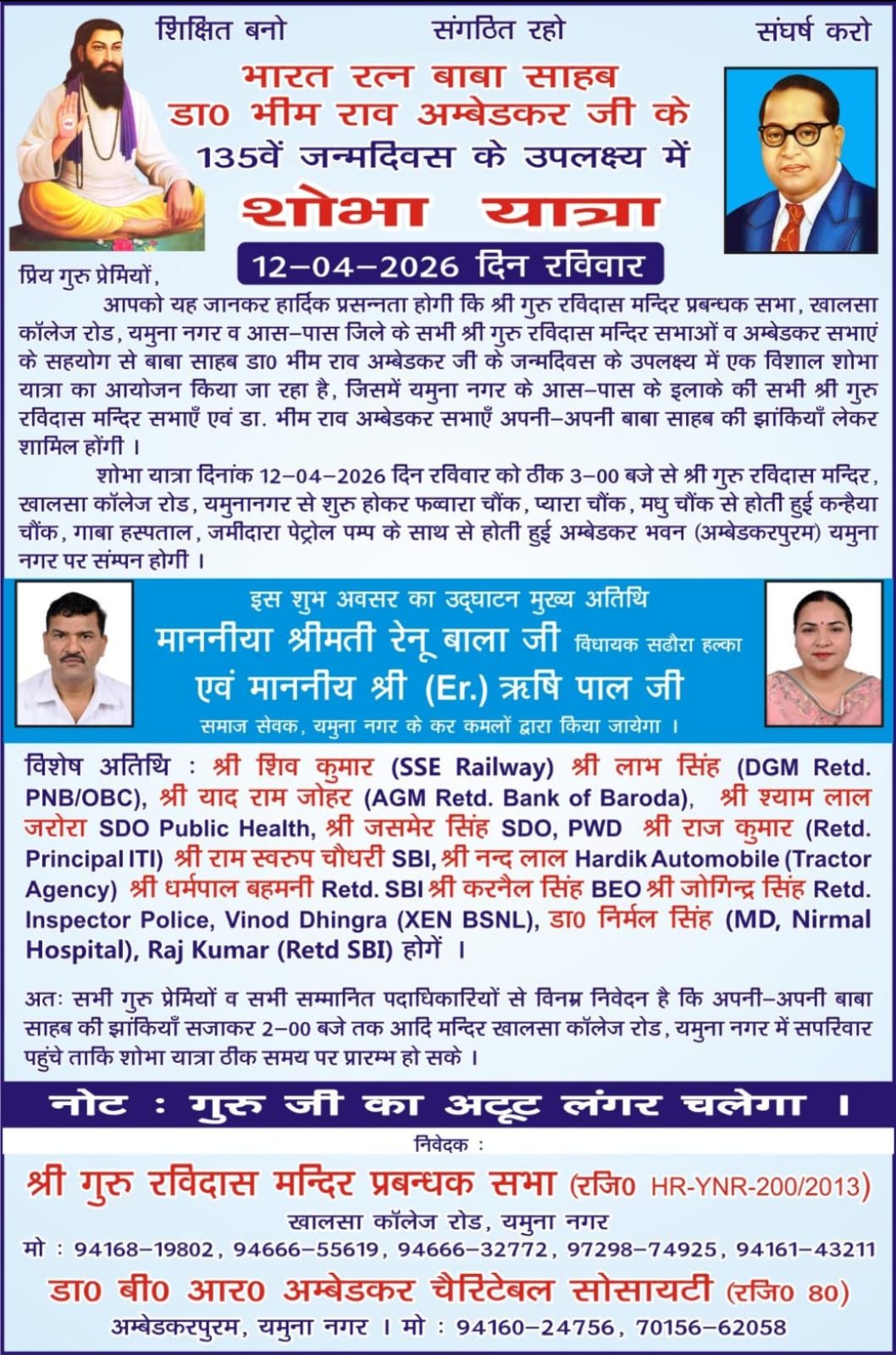 कपुरी :- आज 12 अप्रैल 2026, भारत रत्न डॉ. बाबासाहेब भीमराव अंबेडकर जी के 135वें जन्मदिवस के पावन अवसर पर यमुनानगर में एक भव्य और ऐतिहासिक शोभा यात्रा का आयोजन किया गया। इस गरिमामयी कार्यक्रम में *साढ़ौरा से विधायक मैडम रेनू बाला जी एवं इंजीनियर ऋषिपाल चौधरी जी* ने मुख्य अतिथि के रूप में अपनी उपस्थिति दर्ज कराकर समारोह की शोभा बढ़ाई।