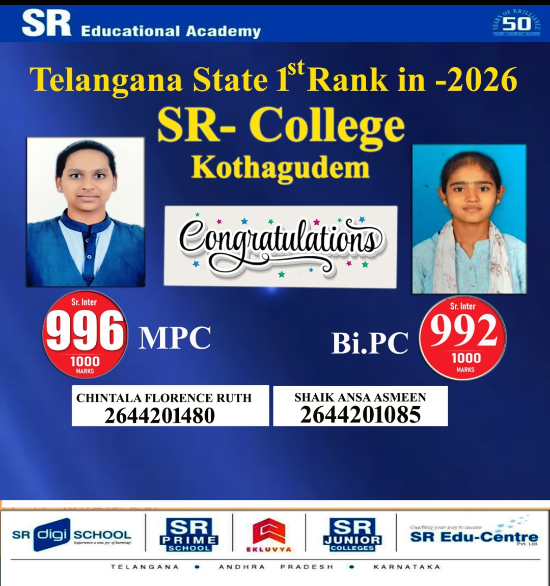 రాష్ట్రస్థాయిలో రెండవ ర్యాంకుతో పాటు మరెన్నో అత్యధిక ఫలితాలతో కొత్తగూడెంలో ప్రభంజనాన్ని సృష్టించి ఎస్ ఆర్ కీర్తి పతాకాన్ని ఎగరవేసింది.