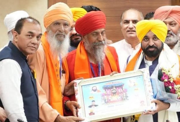 All India Adi Dharma Mission (Regd.) India National President Sant Satwinder Heera, during a special meeting in Chandigarh with the saint community under the Punjab government's outline for programmes marking the 650th Prakash Purb of Satguru Ravidas Maharaj Ji, handed over a simple letter to Punjab Chief Minister Bhagwant Singh Mann regarding the Amrit Dhara Prakash Divas and Baba Sahib Dr. Ambedkar birthday congregations at the historic religious site Sachkhand Begumpura Shri Khuralgarh. He also honoured the Chief Minister by presenting a beautiful model of the Begumpura religious site.