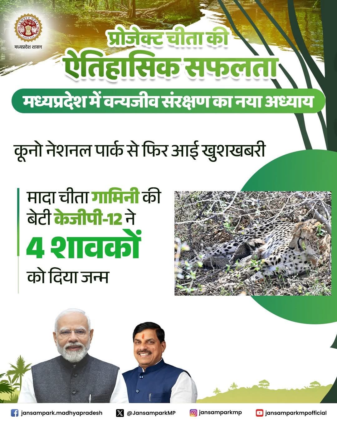 💠मादा चीता 'गामिनी' की बेटी 'केजीपी-12' ने 4 शावकों को दिया जन्म