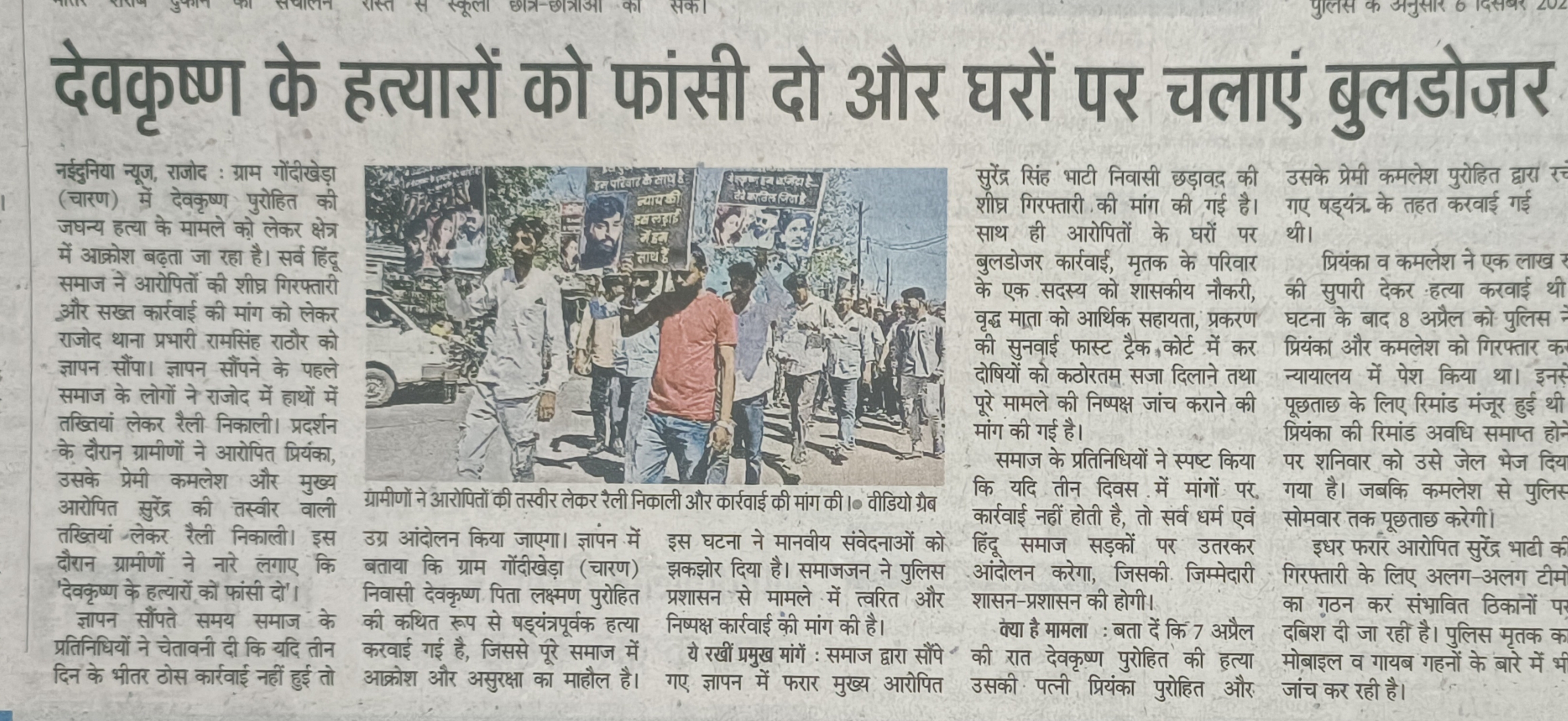 देवकृष्ण के हत्यारों को फांसी दो और घरों पर चलाएं बुलडोजर ।