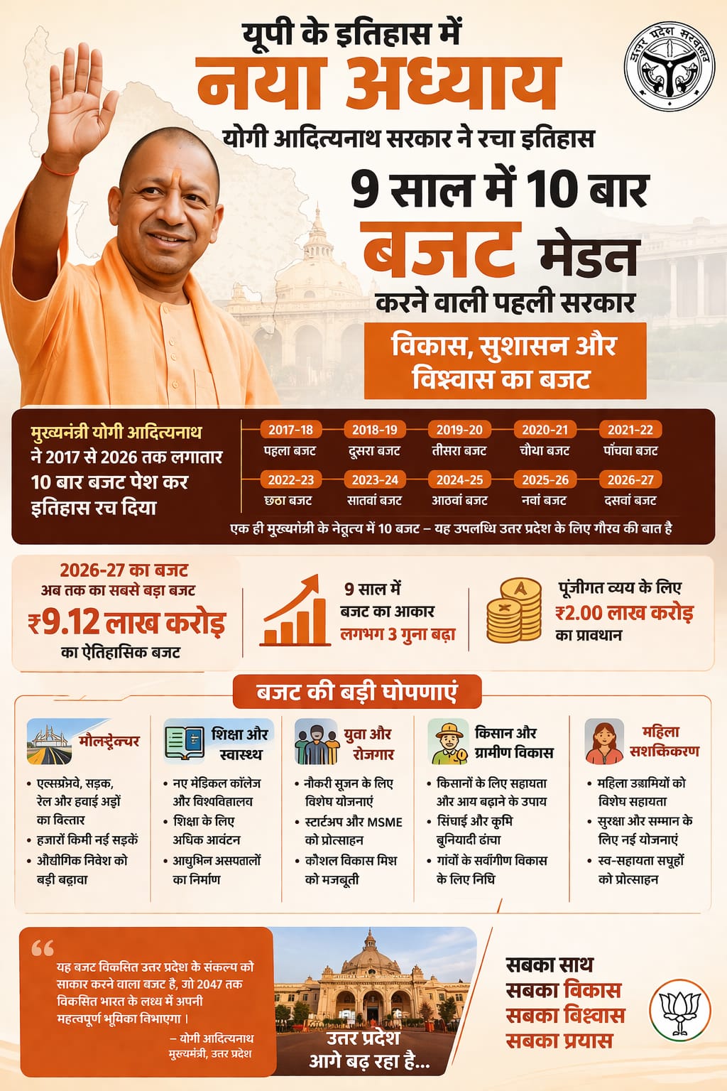 Yogi Adityanath ಅವರು Uttar Pradesh ನಲ್ಲಿ ಸುಮಾರು 9 ವರ್ಷ ಆಡಳಿತದಲ್ಲಿ 10ನೇ ಬಜೆಟ್ ಮಂಡನೆಯಾಗಿದೆ (2017–2026 ಅವಧಿಯಲ್ಲಿ).