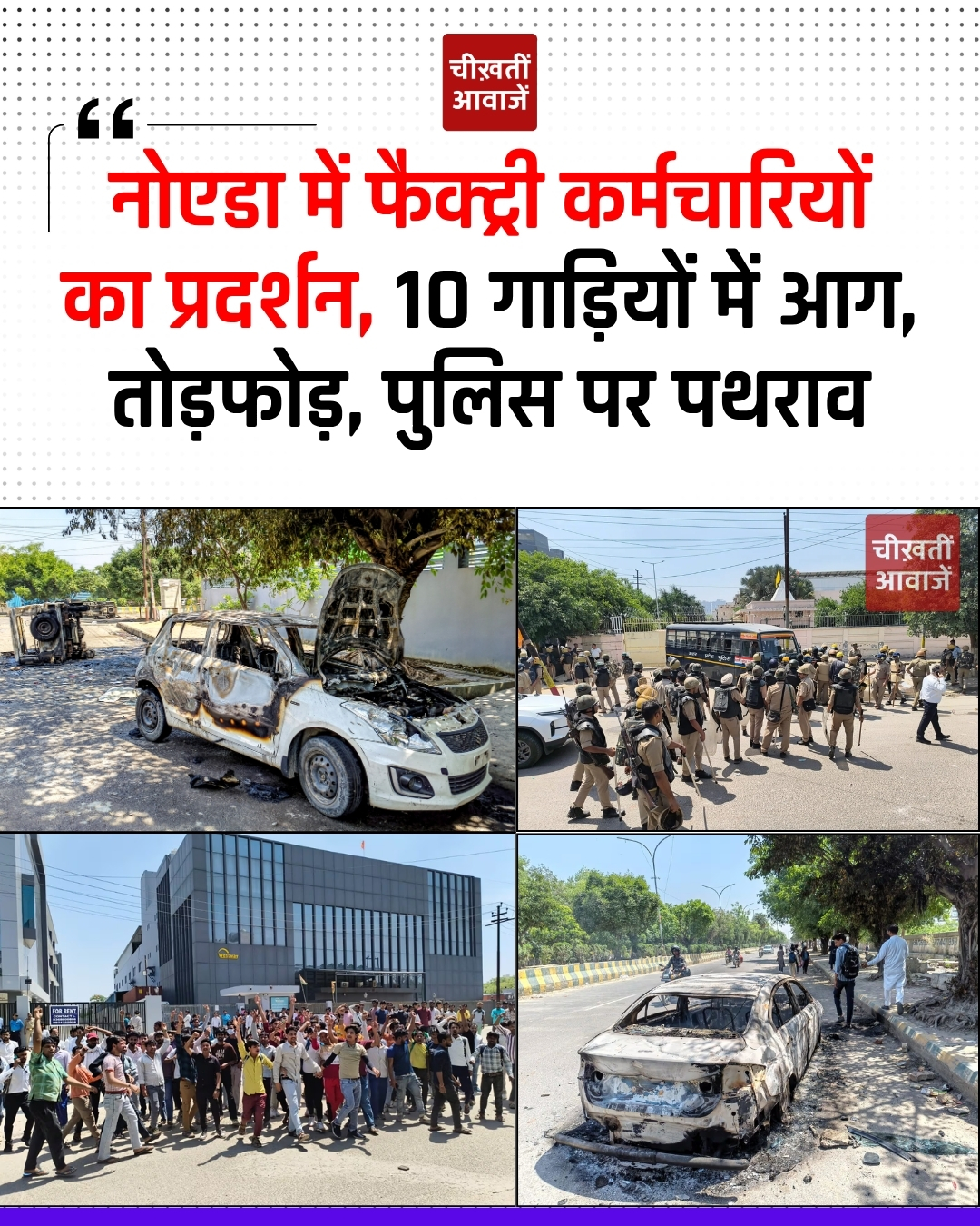 Noida के फेज-2 इंडस्ट्रियल एरिया में प्रदर्शन कर रहे कर्मचारी अचानक उग्र हो गए। गुस्साए कर्मचारियों ने सड़कों पर उतरकर पथराव किया और कई गाड़ियों व बसों में आग लगा दी।