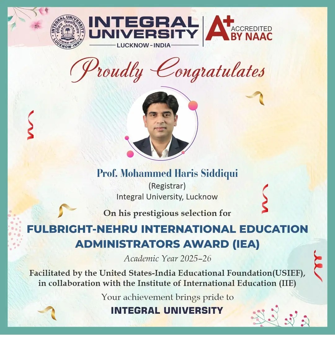 Heartiest congratulations to Prof. Mohammed Haris Siddiqui on his prestigious selection for the Fulbright-Nehru International Education Administrators Award (IEA) 2025–26.