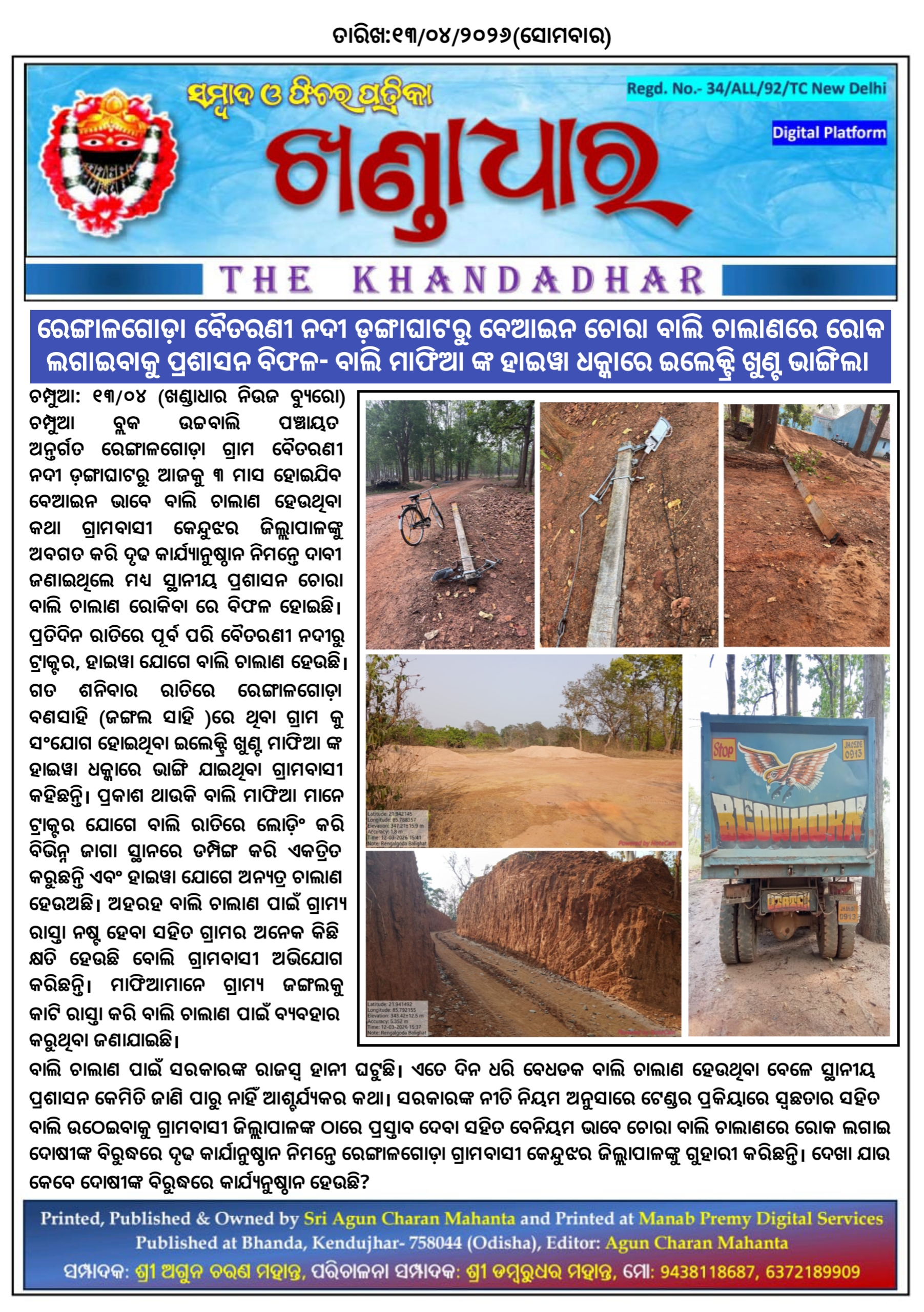 ରେଙ୍ଗାଳଗୋଡ଼ା ବୈତରଣୀ ନଦୀ ଡ଼ଙ୍ଗାଘାଟରୁ ବେଆଇନ ଚୋରା ବାଲି ଚାଲାଣରେ ରୋକ ଲଗାଇବାକୁ ପ୍ରଶାସନ ବିଫଳ- ବାଲି ମାଫିଆ ଙ୍କ ହାଇୱା ଧକ୍କାରେ ଇଲେକ୍ଟ୍ରି ଖୁଣ୍ଟ ଭାଙ୍ଗିଲା।