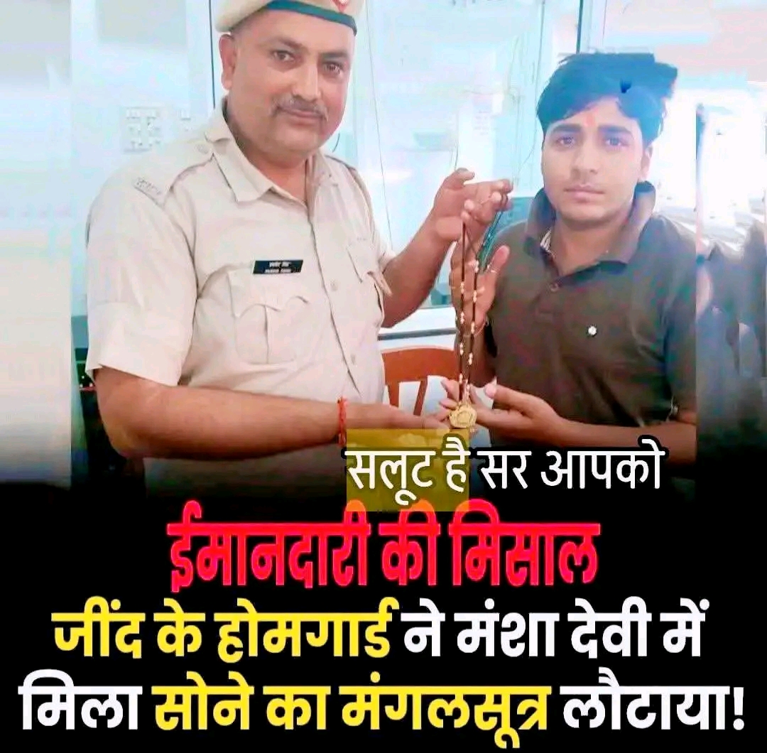 जींद के होमगार्ड जवान रणबीर सिंह ने ईमानदारी की एक मिसाल पेश की है। उन्हें माता मंशा देवी मंदिर परिसर में एक सोने का मंगलसूत्र मिला, जिसे उन्होंने अपने पास रखने के बजाय उसके असली मालिक तक पहुंचाने का जिम्मा उठाया। रणबीर सिंह ने पूरी लगन और जिम्मेदारी के साथ जानकारी जुटाई और आखिरकार मंगलसूत्र के असली मालिक का पता लगाकर उसे सुरक्षित वापस सौंप दिया। इस सराहनीय कार्य ने न सिर्फ लोगों का दिल जीता, बल्कि समाज में भरोसे और ईमानदारी की एक मजबूत मिसाल भी पेश की।