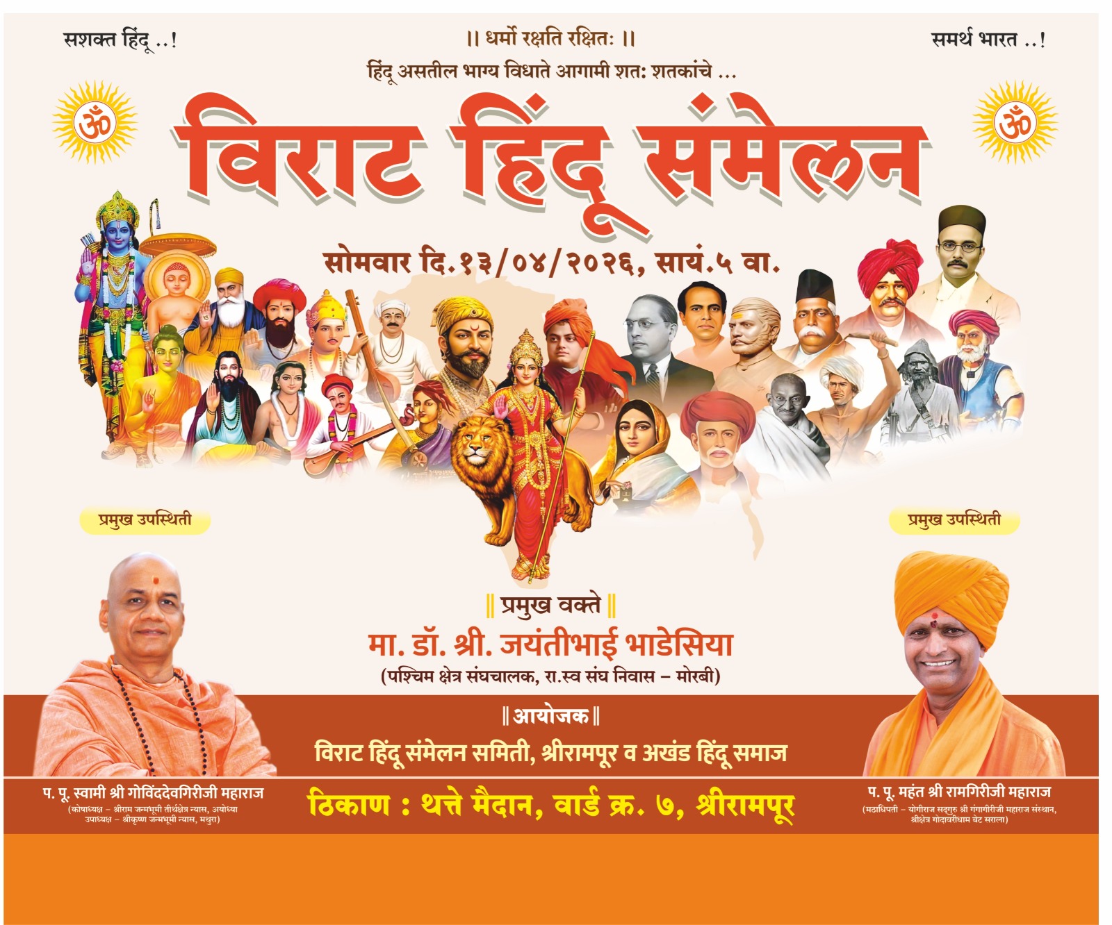 या सभेला प्रमुख उपस्थिती म्हणून स्वामी श्री.गोविंददेवगिरीजी महाराज,कोषाध्यक्ष आयोध्या श्रीराम मंदिर ट्रस्ट व महंत श्री.रामगिरीजी महाराज,सरला बेट गोदावरी धाम संस्थान यांचे प्रमुख मार्गदर्शन लाभणार आहे. हे संमेलन यशस्वी व्हावे यासाठी शहरातील सर्वच हिंदुत्ववादी संघटना कसोशीने प्रयत्न करीत आहे.