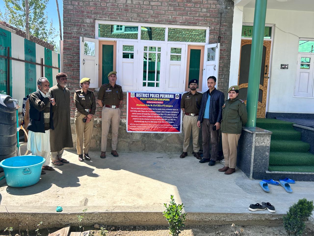 April 13`````Continuing its intensified drive against drug trafficking, Pulwama Police has attached a double storey residential house valued at ₹32,19,000 as per the valuation schedule of the R&B Department, 2022 in Lalhar area of Kakapora, belonging to a convicted narcotics offender.