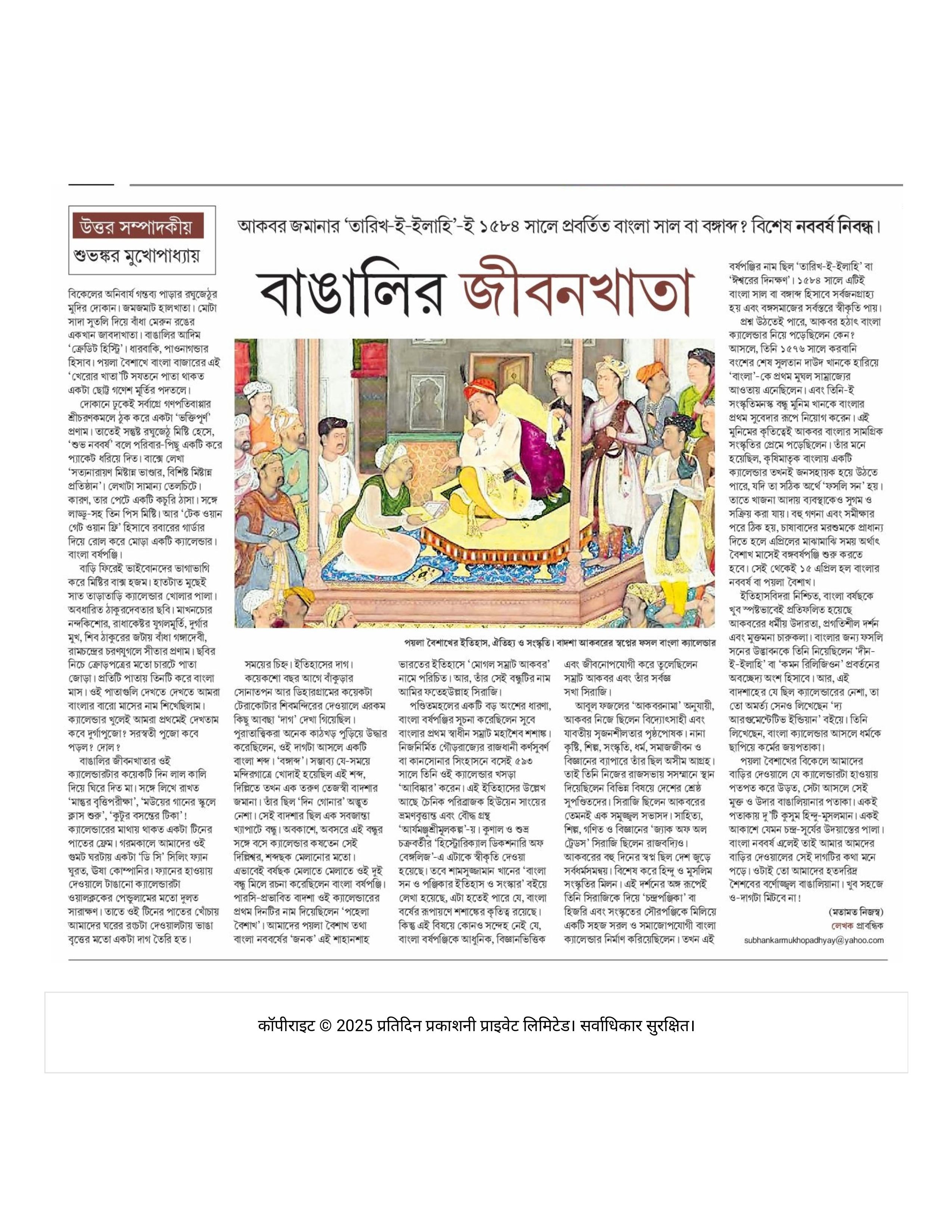 इतिहासकारों का मानना है कि बंगाली कैलेंडर में अकबर की धार्मिक उदारता और प्रगतिशील दर्शन झलकता है। बंगाल के किसानों के लिए बनाया गया यह कैलेंडर 'दीन-ए-इलाही' के समान था। पहली बैसाख हमारे घरों की दीवारों पर लटकने वाला वह कैलेंडर केवल तारीखें नहीं बताता, बल्कि वह हिंदू-मुस्लिम संस्कृति के मिलन का प्रतीक है। बंगाली नववर्ष दरअसल हमारी साझा विरासत है। बचपन का वह हालखाता, वह कैलेंडर और रवि दा की दुकान की स्मृतियां आज भी हमें अपनी जड़ों से जोड़े रखती हैं।