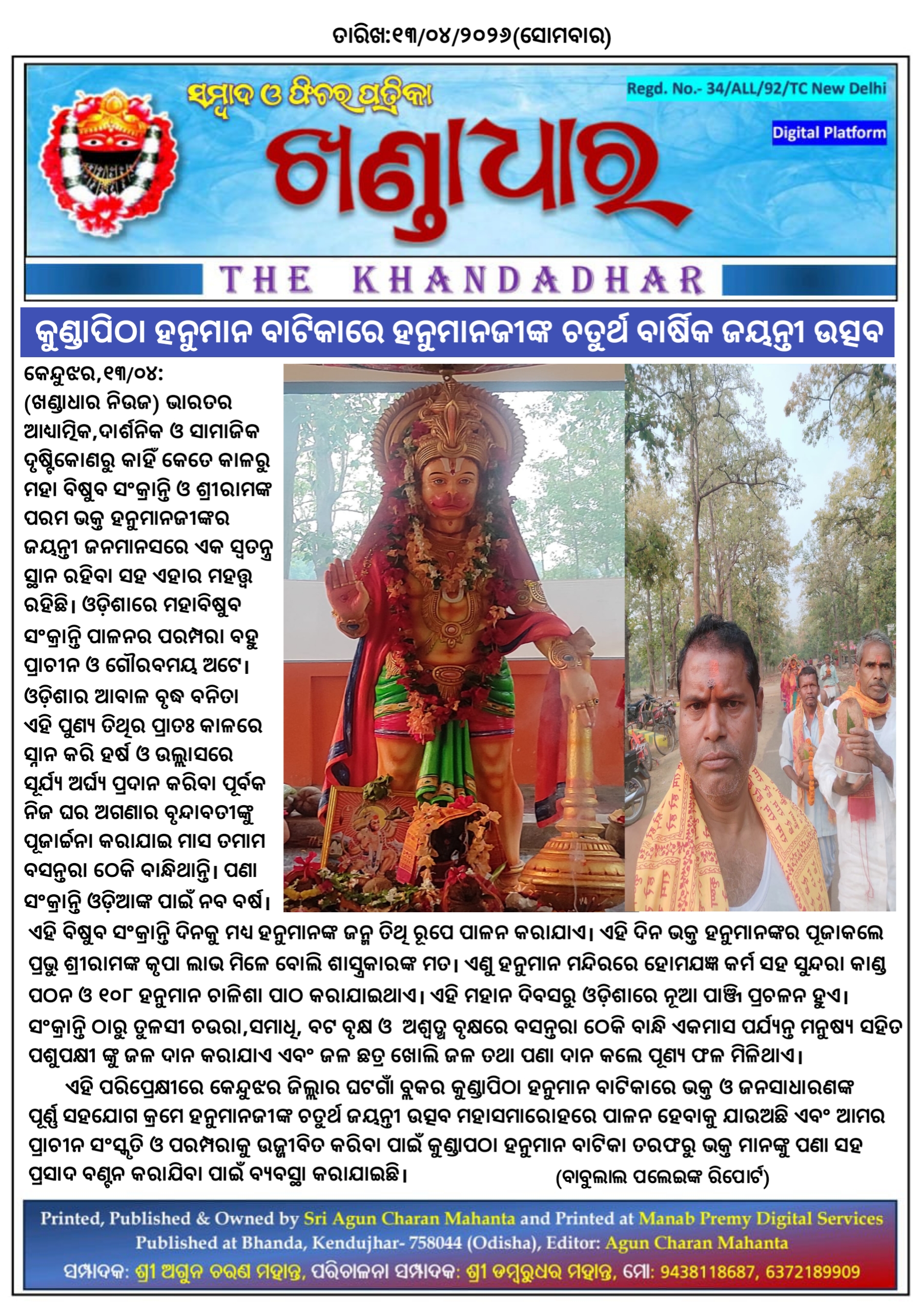 ଏହି ପରିପ୍ରେକ୍ଷୀରେ କେନ୍ଦୁଝର ଜିଲ୍ଲାର ଘଟଗାଁ ବ୍ଲକର କୁଣ୍ଡାପିଠା ହନୁମାନ ବାଟିକାରେ ଭକ୍ତ ଓ ଜନସାଧାରଣଙ୍କ ପୂର୍ଣ୍ଣ ସହଯୋଗ କ୍ରମେ ହନୁମାନଜୀଙ୍କ ଚତୁର୍ଥ ଜୟନ୍ତୀ ଉତ୍ସବ ମହାସମାରୋହରେ ପାଳନ ହେବାକୁ ଯାଉଅଛି ଏବଂ ଆମର ପ୍ରାଚୀନ ସଂସ୍କୃତି ଓ ପରମ୍ପରାକୁ ଉଜ୍ଜୀବିତ କରିବା ପାଇଁ କୁଣ୍ଡାପଠା ହନୁମାନ ବାଟିକା ତରଫରୁ ଭକ୍ତ ମାନଙ୍କୁ ପଣା ସହ ପ୍ରସାଦ ବଣ୍ଟନ କରାଯିବା ପାଇଁ ବ୍ୟବସ୍ଥା କରାଯାଇଛି।