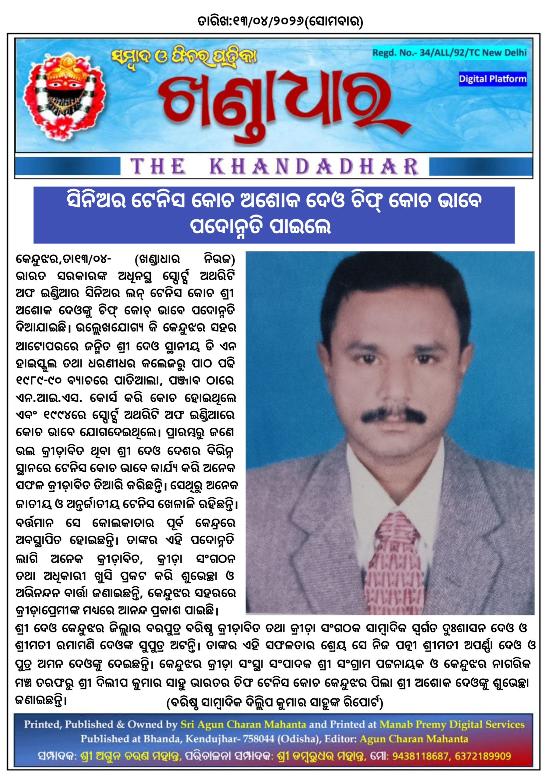 କେନ୍ଦୁଝର,ତା୧୩/୦୪- ଭାରତ ସରକାରଙ୍କ ଅଧିନସ୍ଥ ସ୍ପୋର୍ଟ୍ସ ଅଥରିଟି ଅଫ ଇଣ୍ଡିଆର ସିନିଅର ଲନ୍‌ ଟେନିସ କୋଚ ଶ୍ରୀ ଅଶୋକ ଦେଓଙ୍କୁ ଚିଫ୍ କୋଚ୍ ଭାବେ ପଦୋନ୍ନତି ଦିଆଯାଇଛି। ଉଲ୍ଲେଖଯୋଗ୍ୟ କି କେନ୍ଦୁଝର ସହର ଆଟୋପରରେ ଜନ୍ମିତ ଶ୍ରୀ ଦେଓ ସ୍ଥାନୀୟ ଡି ଏନ ହାଇସ୍କୁଲ ତଥା ଧରଣୀଧର କଲେଜରୁ ପାଠ ପଢି ୧୯୮୯-୯୦ ବ୍ୟାଚରେ ପାତିଆଲା, ପଞ୍ଜାବ ଠାରେ ଏନ.ଆଇ.ଏସ. କୋର୍ସ କରି କୋଚ ହୋଇଥିଲେ ଏବଂ ୧୯୯୪ରେ ସ୍ପୋର୍ଟ୍ସ ଅଥରିଟି ଅଫ ଇଣ୍ଡିଆରେ କୋଚ ଭାବେ ଯୋଗଦେଇଥିଲେ। ପ୍ରାରମ୍ଭରୁ ଜଣେ ଭଲ କ୍ରୀଡ଼ାବିତ ଥିବା ଶ୍ରୀ ଦେଓ ଦେଶର ବିଭିନ୍ନ ସ୍ଥାନରେ ଟେନିସ କୋଚ ଭାବେ କାର୍ଯ୍ୟ କରି ଅନେକ ସଫଳ କ୍ରୀଡ଼ାବିତ ତିଆରି କରିଛନ୍ତି। ସେଥିରୁ ଅନେକ ଜାତୀୟ ଓ ଅନ୍ତର୍ଜାତୀୟ ଟେନିସ ଖେଳାଳି ରହିଛନ୍ତି। ବର୍ତ୍ତମାନ ସେ କୋଲକାତାର ପୂର୍ବ କେନ୍ଦ୍ରରେ ଅବସ୍ଥାପିତ ହୋଇଛନ୍ତି। ତାଙ୍କର ଏହି ପଦୋନ୍ନତି ଲାଗି ଅନେକ କ୍ରୀଡ଼ାବିତ, କ୍ରୀଡ଼ା ସଂଗଠନ ତଥା ଅଧିକାରୀ ଖୁସି ପ୍ରକଟ କରି ଶୁଭେଚ୍ଛା ଓ ଅଭିନନ୍ଦନ ବାର୍ତ୍ତା ଜଣାଇଛନ୍ତି, କେନ୍ଦୁଝର ସହରରେ କ୍ରୀଡ଼ାପ୍ରେମୀଙ୍କ ମଧ୍ୟରେ ଆନନ୍ଦ ପ୍ରକାଶ ପାଇଛି। ଶ୍ରୀ ଦେଓ କେନ୍ଦୁଝର ଜିଲ୍ଲାର ବରପୁତ୍ର ବରିଷ୍ଠ କ୍ରୀଡ଼ାବିତ ତଥା କ୍ରୀଡ଼ା ସଂଗଠକ ସାମ୍ବାଦିକ ସ୍ବର୍ଗତ ଦୁଃଶାସନ ଦେଓ ଓ ଶ୍ରୀମତୀ ରମାମଣି ଦେଓଙ୍କ ସୁପୁତ୍ର ଅଟନ୍ତି। ତାଙ୍କର ଏହି ସଫଳତାର ଶ୍ରେୟ ସେ ନିଜ ପତ୍ନୀ ଶ୍ରୀମତୀ ଅପର୍ଣ୍ଣା ଦେଓ ଓ ପୁତ୍ର ଅମନ ଦେଓଙ୍କୁ ଦେଇଛନ୍ତି। କେନ୍ଦୁଝର କ୍ରୀଡ଼ା ସଂସ୍ଥା ସଂପାଦକ ଶ୍ରୀ ସଂଗ୍ରାମ ପଟ୍ଟନାୟକ ଓ କେନ୍ଦୁଝର ନାଗରିକ ମଞ୍ଚ ତରଫରୁ ଶ୍ରୀ ଦିଲୀପ କୁମାର ସାହୁ ଭାରତର ଚିଫ ଟେନିସ କୋଚ କେନ୍ଦୁଝର ପିଲା ଶ୍ରୀ ଅଶୋକ ଦେଓଙ୍କୁ ଶୁଭେଚ୍ଛା ଜଣାଇଛନ୍ତି।