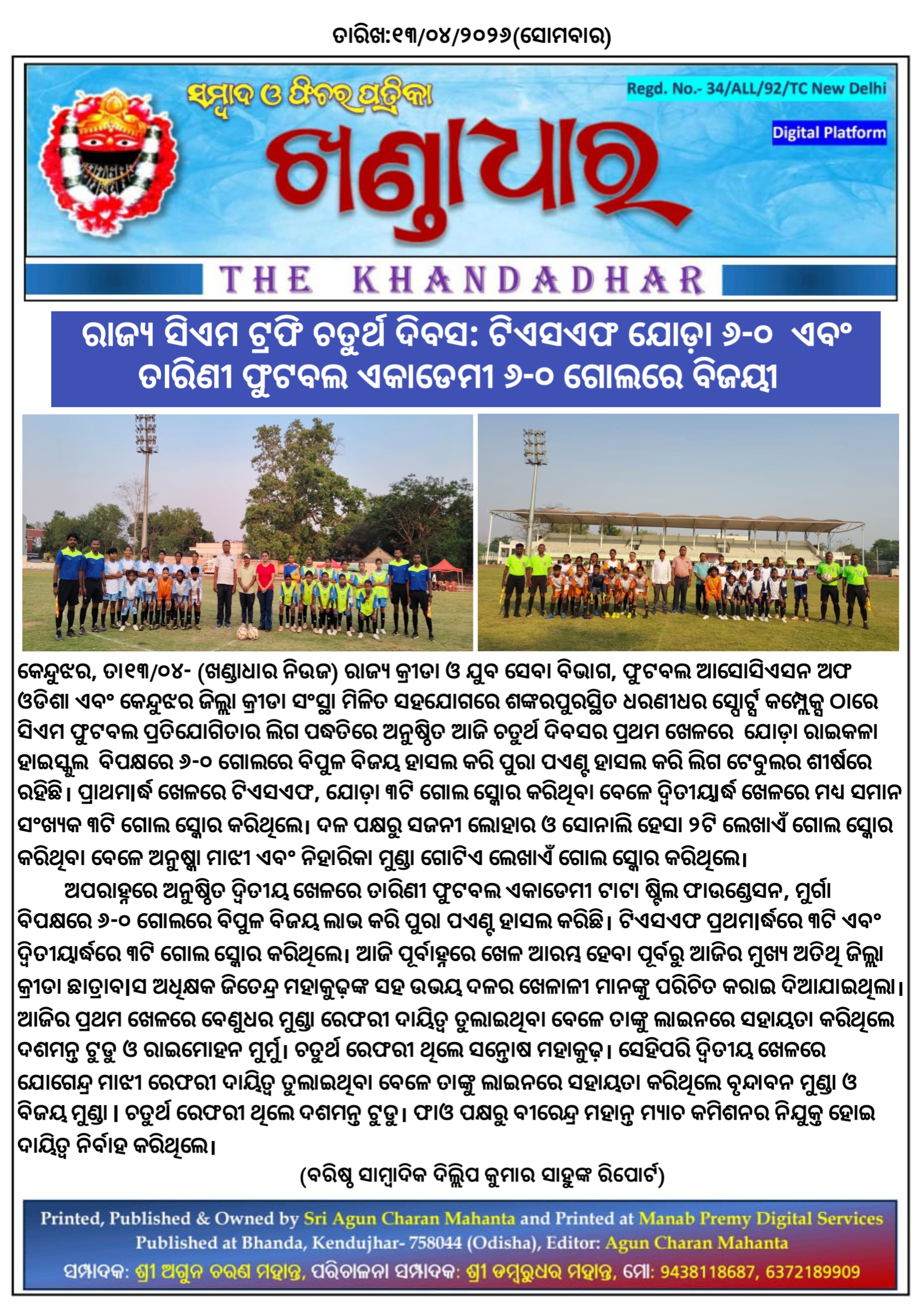 ଟିଏସଏଫ ଯୋଡ଼ା ୬-୦ ଏବଂ ତାରିଣୀ ଫୁଟବଲ ଏକାଡେମୀ ୬-୦ ଗୋଲରେ ବିଜୟୀ।