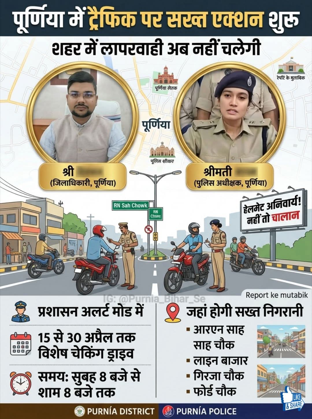 पूर्णिया में ट्रैफिक पर सख्ती: 15 से 30 अप्रैल तक चलेगा विशेष चेकिंग अभियान