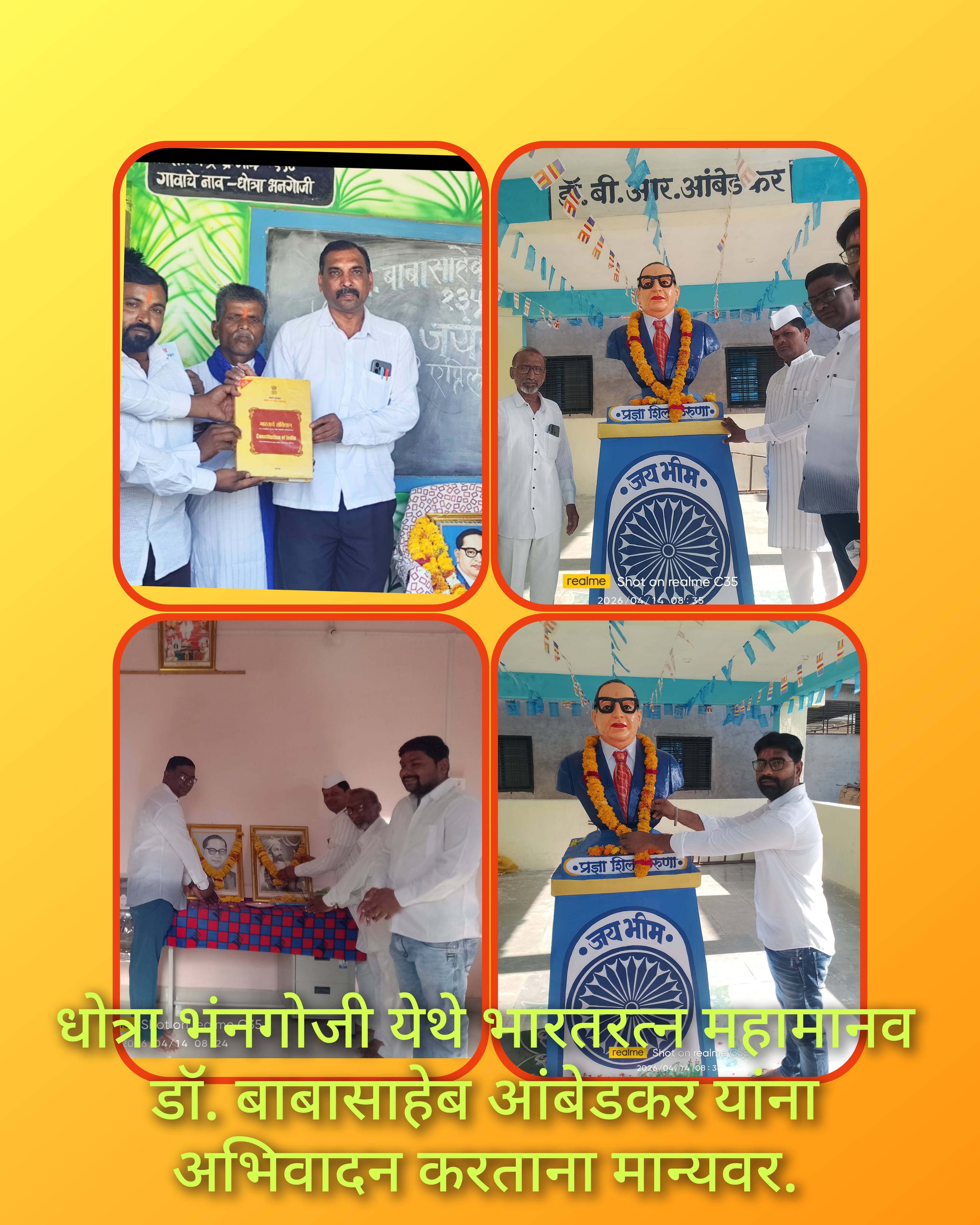 डॉ. बाबासाहेब आंबेडकरांचे विचार आचरणात आणून, समतामूलक समाज घडवण्याचा संकल्प या जयंतीनिमित्त करण्यात आला आहे . भारतरत्न डॉ. बाबासाहेब आंबेडकर यांच्या जयंतीनिमित्त प्रमुख उपस्थितीत, सरपंच धोत्रा भनगोजी, सर्व ग्रामपंचायत सदस्य, शिक्षण व्यवस्थापन समिती अध्यक्ष व सर्व सदस्य, शाळेचे मुख्याध्यापक सर्व शिक्षक वृंद व शिक्षिका, अंगणवाडी सेविका व कर्मचारी, गावातील प्रतिष्ठित नागरिक, माता भगिनी व ,पत्रकार बांधव, समाजसेवक, बौद्ध समाजातील प्रतिष्ठित नागरिक व तरुण मंडळी, माता-भगिनी विद्यार्थी विद्यार्थिनी, भारतरत्न डॉक्टर बाबासाहेब आंबेडकर यांच्या जयंतीनिमित्त, गावातील सर्व मान्यवर व्यक्ती. उपस्थित होते.!!