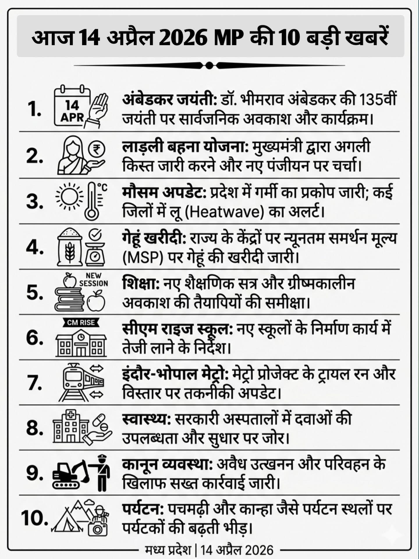 आज 14 अप्रैल 2026 एमपी की 10 बड़ी खबरें