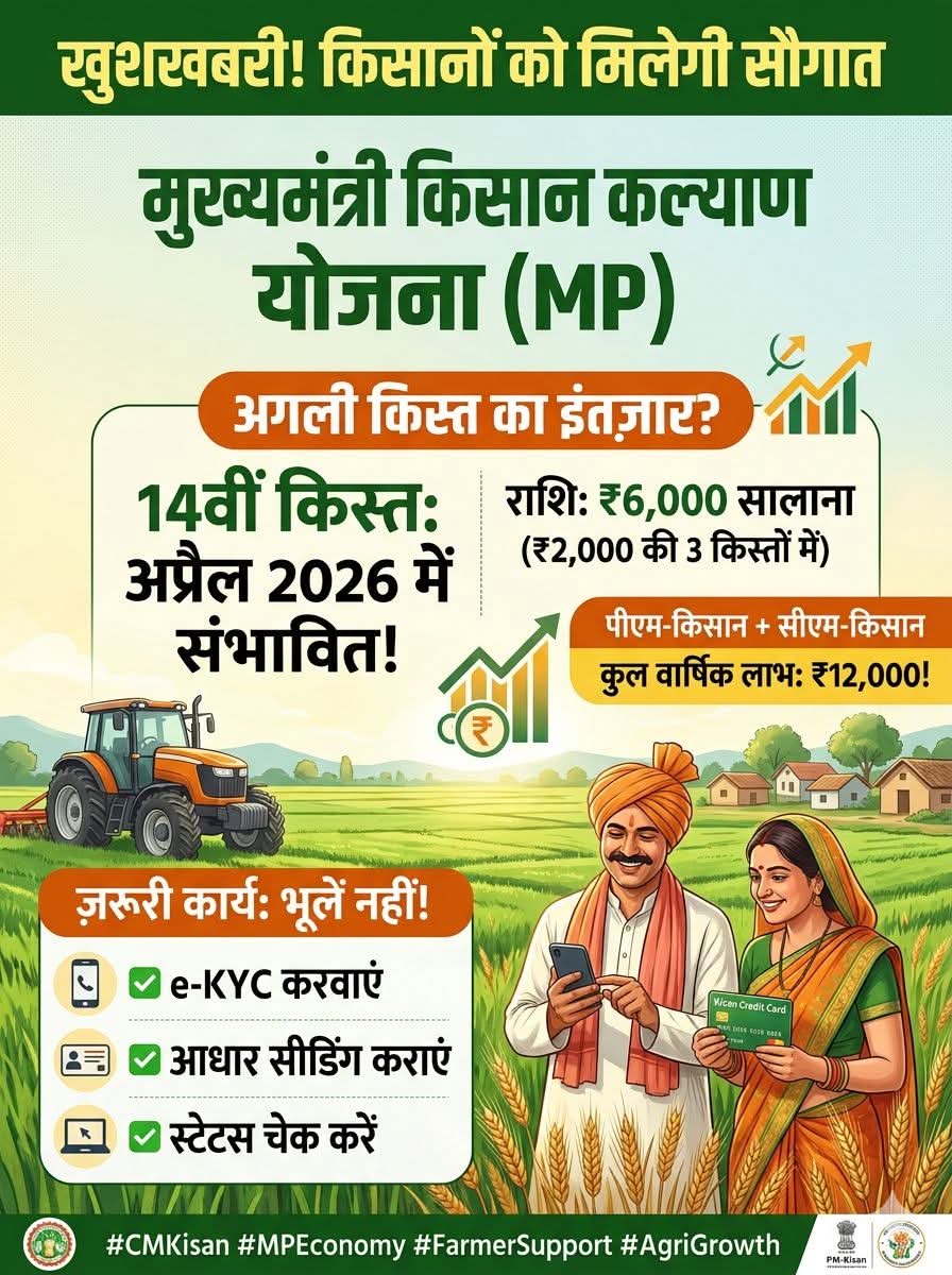 मध्य प्रदेश के किसान भाइयों के लिए खुशखबरी! CM किसान कल्याण योजना की 14वीं किस्त.....