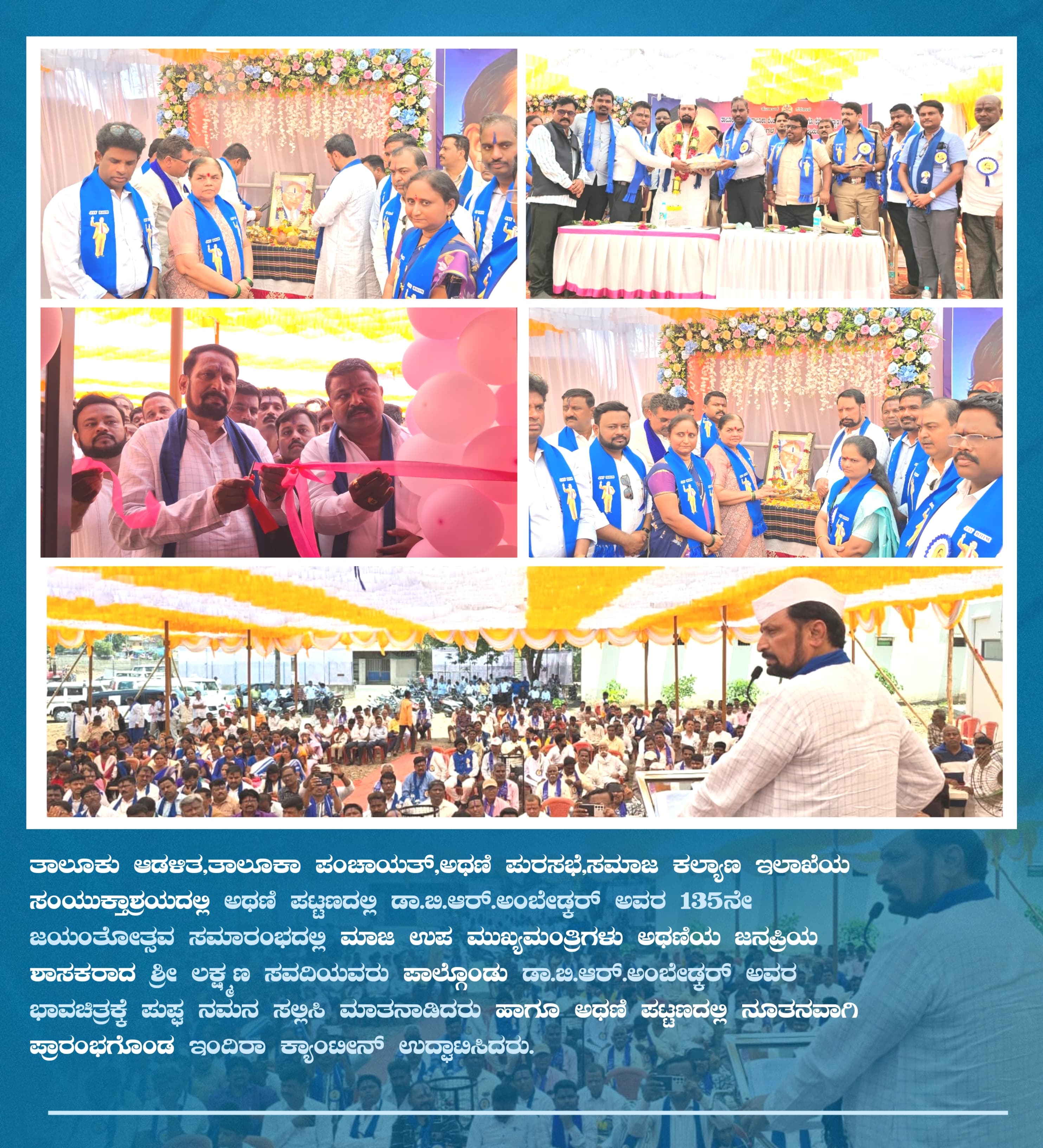 ತಾಲೂಕು ಆಡಳಿತ,ತಾಲೂಕಾ ಪಂಚಾಯತ್,ಅಥಣಿ ಪುರಸಭೆ,ಸಮಾಜ ಕಲ್ಯಾಣ ಇಲಾಖೆಯ ಸಂಯುಕ್ತಾಶ್ರಯದಲ್ಲಿ ಅಥಣಿ ಪಟ್ಟಣದಲ್ಲಿ ಡಾ.ಬಿ.ಆರ್.ಅಂಬೇಡ್ಕರ್ ಅವರ 135ನೇ ಜಯಂತೋತ್ಸವ ಸಮಾರಂಭದಲ್ಲಿ ಮಾಜಿ ಉಪ ಮುಖ್ಯಮಂತ್ರಿಗಳು ಹಾಗೂ ಅಥಣಿ ಕ್ಷೇತ್ರದ ಜನಪ್ರಿಯ ಶಾಸಕರಾದ ಶ್ರೀ ಲಕ್ಷ್ಮಣ ಸವದಿ ಸಾಹುಕಾರ ಅವರು ಪಾಲ್ಗೊಂಡು ಡಾ.ಬಿ.ಆರ್.ಅಂಬೇಡ್ಕರ್ ಅವರ ಭಾವಚಿತ್ರಕ್ಕೆ ಪುಪ್ಷ ನಮನ ಸಲ್ಲಿಸಿ ,ಅವರು ನೀಡಿದ ಕೊಡುಗೆಗಳನ್ನು ಸ್ಮರಿಸಿದರು ಹಾಗೂ ಅಥಣಿ ಪಟ್ಟಣದಲ್ಲಿ ನೂತನವಾಗಿ ಪ್ರಾರಂಭಗೊಂಡ ಇಂದಿರಾ ಕ್ಯಾಂಟೀನ್ ಉದ್ಘಾಟಿಸಿದರು.