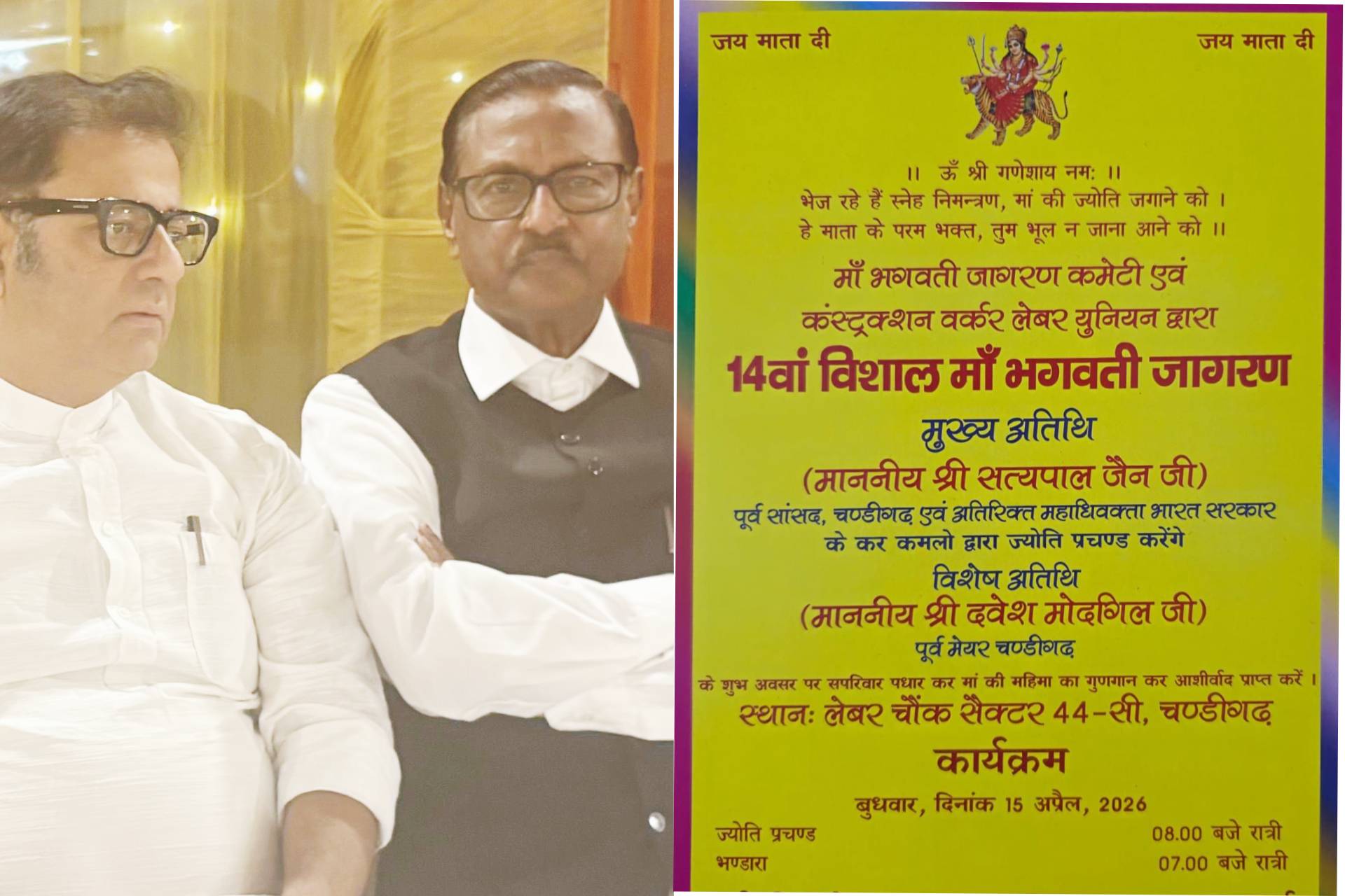 मनोज शर्मा,चंडीगढ़। चंडीगढ़ के सेक्टर-44सी स्थित लेबर चौक में 15 अप्रैल 2026, बुधवार को 14वें विशाल माँ भगवती जागरण का आयोजन किया जा रहा है। यह आयोजन माँ भगवती जागरण कमेटी एवं कंस्ट्रक्शन वर्कर लेबर यूनियन के संयुक्त तत्वावधान में होगा।