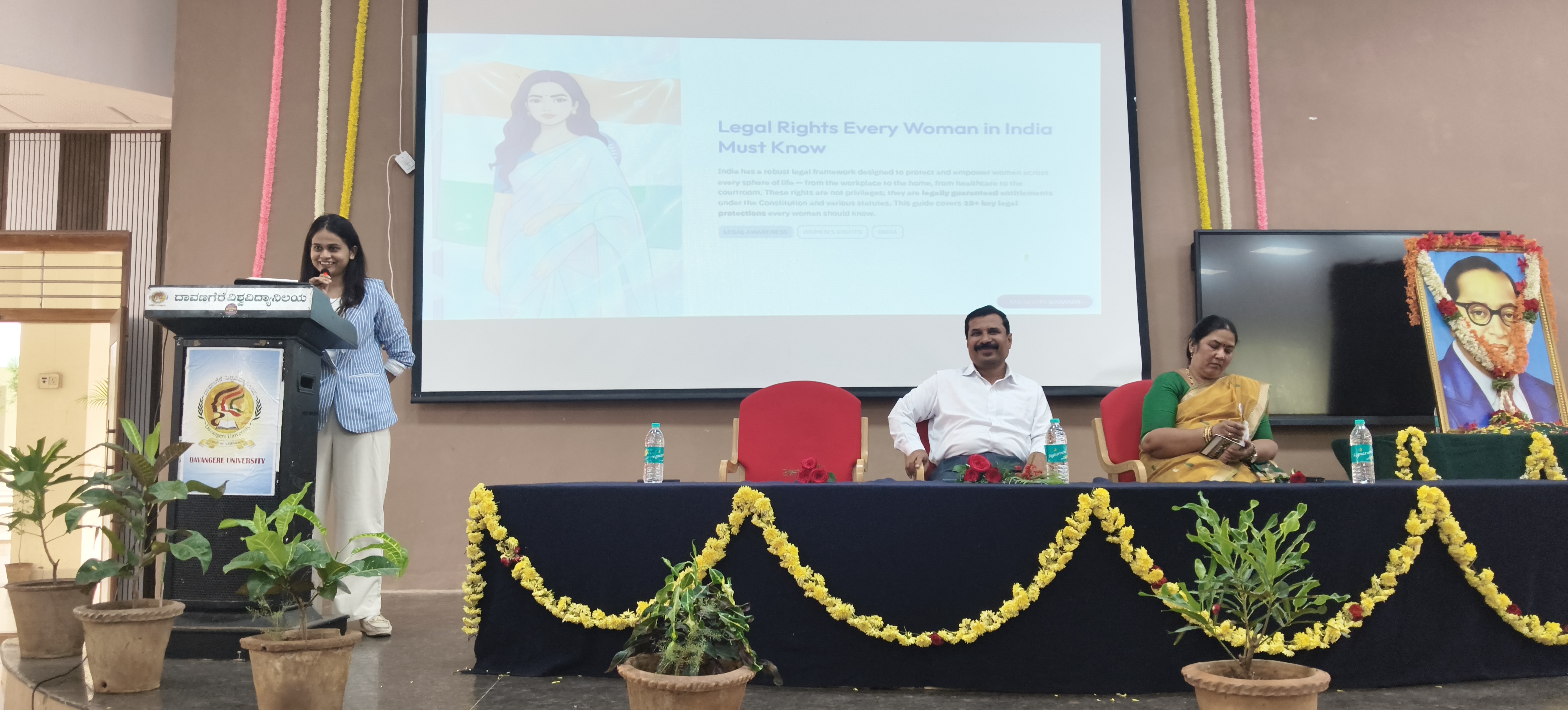 ಕಾರ್ಯಕ್ರಮದಲ್ಲಿ ಮಾನ್ಯ ಆಡಳಿತ ಕುಲ ಸಚಿವರಾದ ಶ್ರೀ ಎಸ್. ಬಿ. ಗಂಟಿ ಅವರು ಮಾತನಾಡಿ, ಮಹಿಳೆಯರು ವೇದಗಳ ಕಾಲದಿಂದಲೂ ಮಹತ್ವದ ಸ್ಥಾನವನ್ನು ಪಡೆದಿದ್ದಾರೆ. ಇಂದಿನ ದಿನಗಳಲ್ಲಿ ಮಹಿಳೆಯರು ಕಾನೂನಿನ ಸದ್ಬಳಕೆಯನ್ನು ಮಾಡಿಕೊಂಡು ತಮ್ಮನ್ನು ತಾವು ಸುರಕ್ಷಿತವಾಗಿರಿಸಿಕೊಳ್ಳಬೇಕು ಎಂದು ಹೇಳಿದರು.
