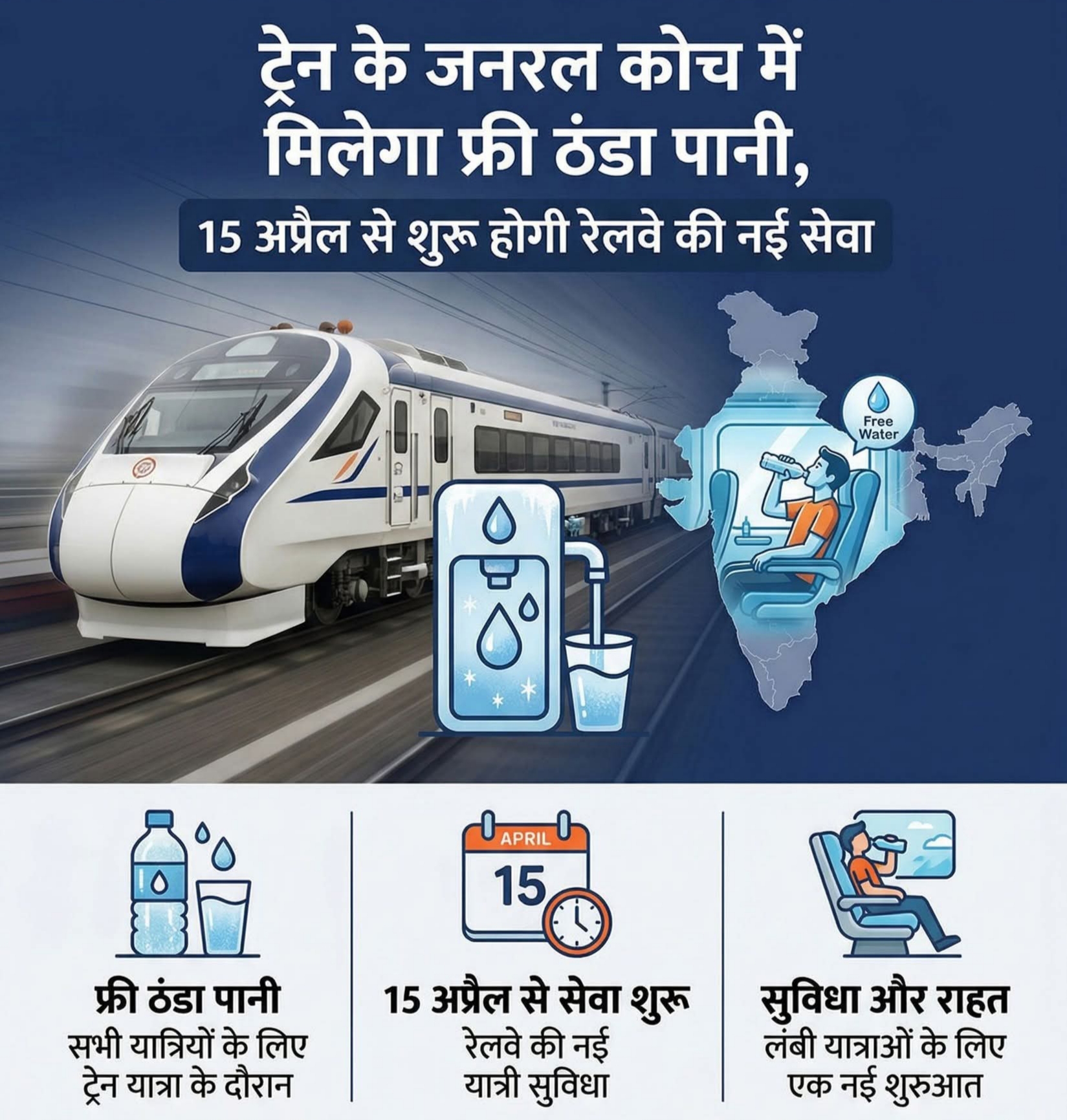 उत्तर मध्य रेलवे (एनसीआर) ने यात्रियों के लिए एक शानदार और महत्वपूर्ण पहल की घोषणा की है! 15 अप्रैल, 2026 से, लंबी दूरी की ट्रेनों में सामान्य डिब्बों में यात्रा करने वाले सभी यात्रियों को उनकी सीटों पर मुफ्त ठंडा पानी मिलेगा! गर्मी के इस तीव्र मौसम में, यह कदम यात्रियों को राहत प्रदान करने के लिए उठाया गया है, ताकि वे अपनी यात्रा के दौरान हमेशा हाइड्रेटेड रहें।