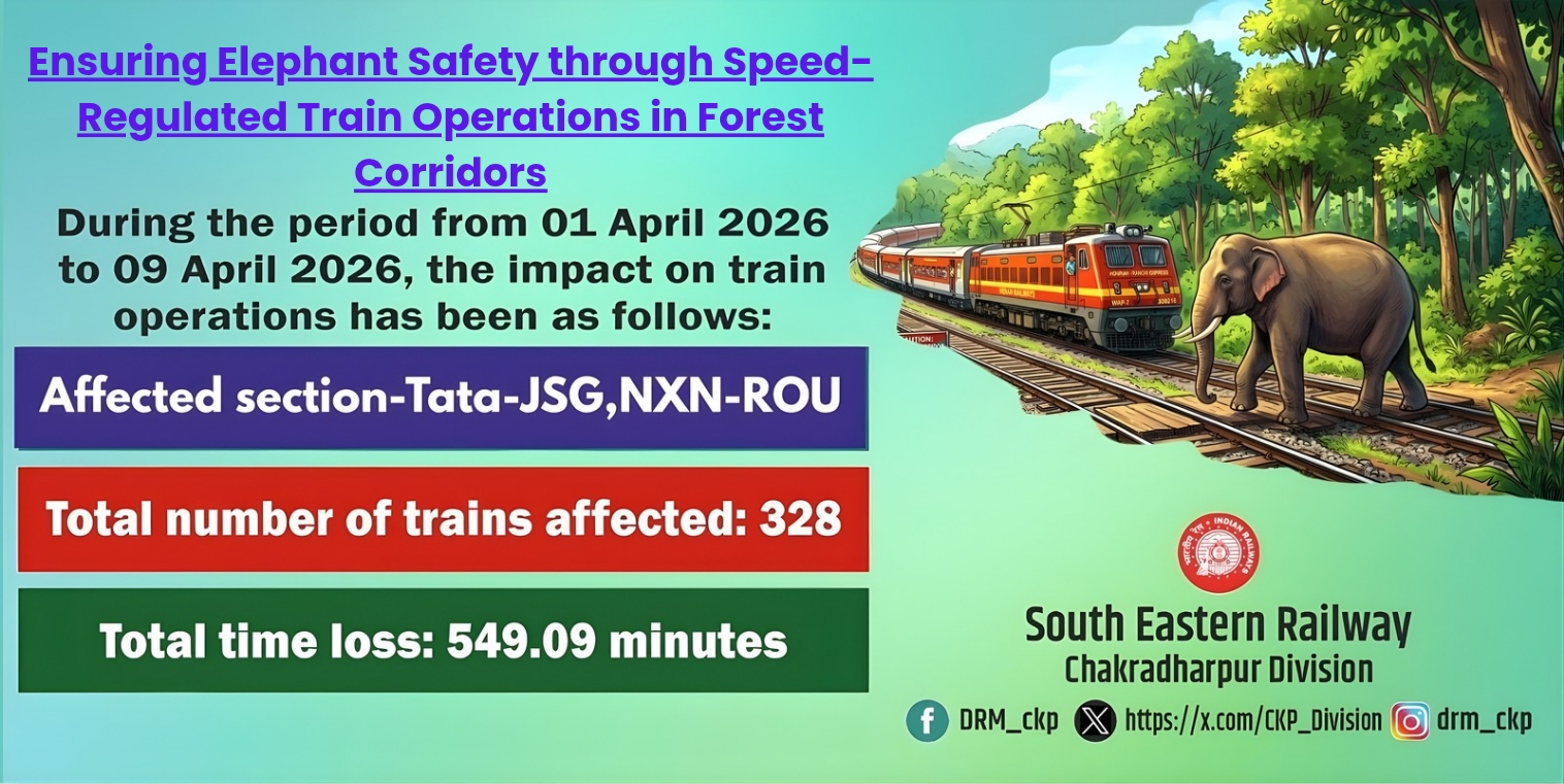 जमशेदपुर/चक्रधरपुर: वन्यजीव संरक्षण की दिशा में एक अहम पहल करते हुए दक्षिण पूर्व रेलवे के चक्रधरपुर मंडल ने हाथियों की सुरक्षा सुनिश्चित करने के लिए फॉरेस्ट कॉरिडोर क्षेत्रों में ट्रेनों की गति को नियंत्रित किया है। इस विशेष अभियान के तहत 01 अप्रैल 2026 से 09 अप्रैल 2026 के बीच ट्रेनों के संचालन पर प्रभाव का आंकड़ा भी सामने आया है, जो इस प्रयास की गंभीरता और प्राथमिकता को दर्शाता है।