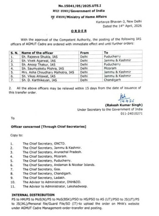 चंडीगढ़ दिल्ली मंगलवार 14 अप्रैल 2026 अल्फा न्यूज़ इंडिया आरके विक्रमा शर्मा अनिल शारदा— भारत सरकारके अवर सचिव राकेश कुमार सिंह के हस्ताक्षरों के अंतर्गत सात भारतीय प्रशासनिक सेवा अधिकारियों का यहां से वहां स्थानांतरण किया गया है। सात आईएएस अधिकारियों का स्थानांतरण किया गया है इसके मुताबिक डी कार्तिकेयन इस को नई दिल्ली से चंडीगढ़ ट्रांसफर किया गया है।। भारतीय सरकार के आदेश अनुसार सभी अधिकारियों को 15 दिनों के अंदर अपनी-अपनी नई पोस्टिंग ज्वॉइन करनी होगी।