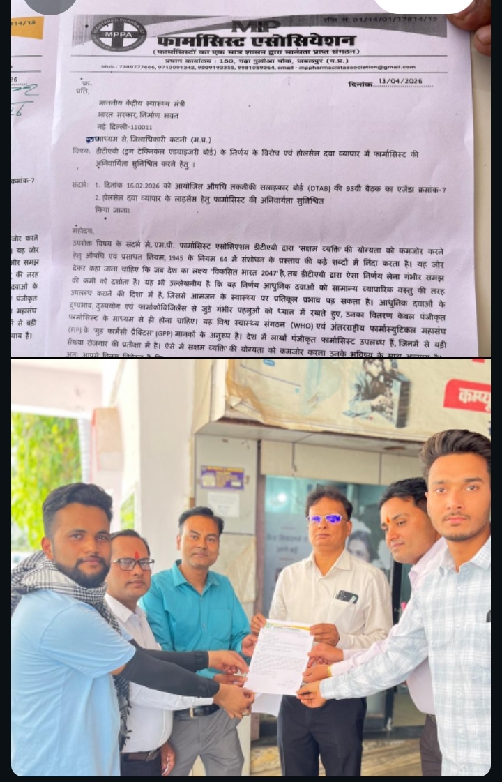 एम पी फार्मासिस्ट एसोसिएशन MPPA के जिलाध्यक्ष कपिल देव गुप्ता ने बताया कि हाल ही में ड्रग्स टेक्निकल एडवाइजरी बोर्ड की 93वीं बैठक में ड्रग्स एक्ट 1945 के नियम 64 में बदलाव का प्रस्ताव बनाया गया है। इसके अनुसार अब दवा दुकान पर पंजीकृत फार्मासिस्ट ही नहीं, बल्कि साइंस ग्रेजुएट भी (सक्षम व्यक्ति) दवाएं बेच सकता है।उक्त गलत निर्णय को लेकर आज एक ज्ञापन केंद्रीय मंत्री जे पी नड्डा के नाम एम पी फार्मासिस्ट एसोसिएशन MPPA द्वारा संयुक्त कलेक्टर प्रदीप मिश्रा को दिया।ज्ञापन में बताया कि उक्त गलत निर्णय को लेकर संघटन एमपी फार्मासिस्ट एसोसिएशन ने केंद्र सरकार को पत्र लिखकर ड्रग्स टेक्निकल एडवाइजरी बोर्ड के हालिया फैसले का कड़ा विरोध जताया है। दरअसल, ड्रग्स टेक्निकल एडवाइजरी बोर्ड की 93वीं बैठक में ड्रग्स एक्ट 1945 के नियम 64 में बदलाव का प्रस्ताव बनाया गया है। इसके अनुसार अब दवा दुकान पर पंजीकृत फार्मासिस्ट ही नहीं, बल्कि साइंस ग्रेजुएट भी (सक्षम व्यक्ति) दवाएं बेच सकता है। उसके पास बस दो साल का अनुभव और 6 महीने का सर्टिफिकेट कोर्स होना अनिवार्य होगा। एसोसिएशन का कहना है कि यह मरीजों के साथ खिलवाड़ साबित हो सकता है। कपिल देव गुप्ता ने बताया कि फार्मासिस्ट लाइफ सेविंग ड्रग बेचते हैं। इनके साइड इफेक्ट, डोजिंग और इंटरैक्शन बेहद जटिल होते हैं। बिना पूरी फार्मेसी ट्रेनिंग के दवा वितरण की अनुमति पब्लिक हेल्थ रिस्क है।