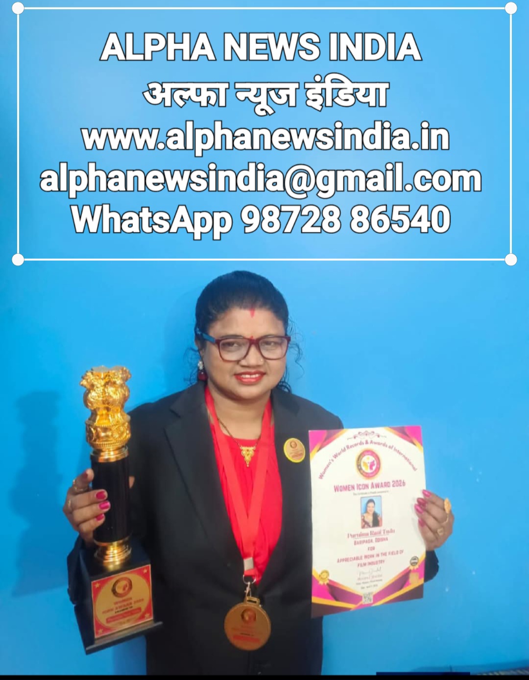 चंडीगढ़ बुधवार 15 अप्रैल 2026 आरके विक्रमा शर्मा अनिल शारदा प्रस्तुति---- श्रीमती पूर्णिमा रानी टुडू, बारीपदा, मयूरभंज, ओडिशा से हैं। "Women Icon Awards 2026" - यह एक ऑनलाइन अवॉर्ड है, जो रानी को वूमेन विश्व कीर्तिमान संगठन ['Women World Records Organization'] द्वारा भारतीय सिनेमा के क्षेत्र में उनकी प्रेरणादायक उपलब्धियों के लिए एक असाधारण महिला के तौर पर प्रदान किया गया है।वुमेन आइकन अवार्ड 2026 से सम्मानित पूर्णिमा रानी टुडू को अल्फा न्यूज इंडिया ने बधाई देते हुए उज्जवल भविष्य की शुभ कामनाएँ दी हैं.