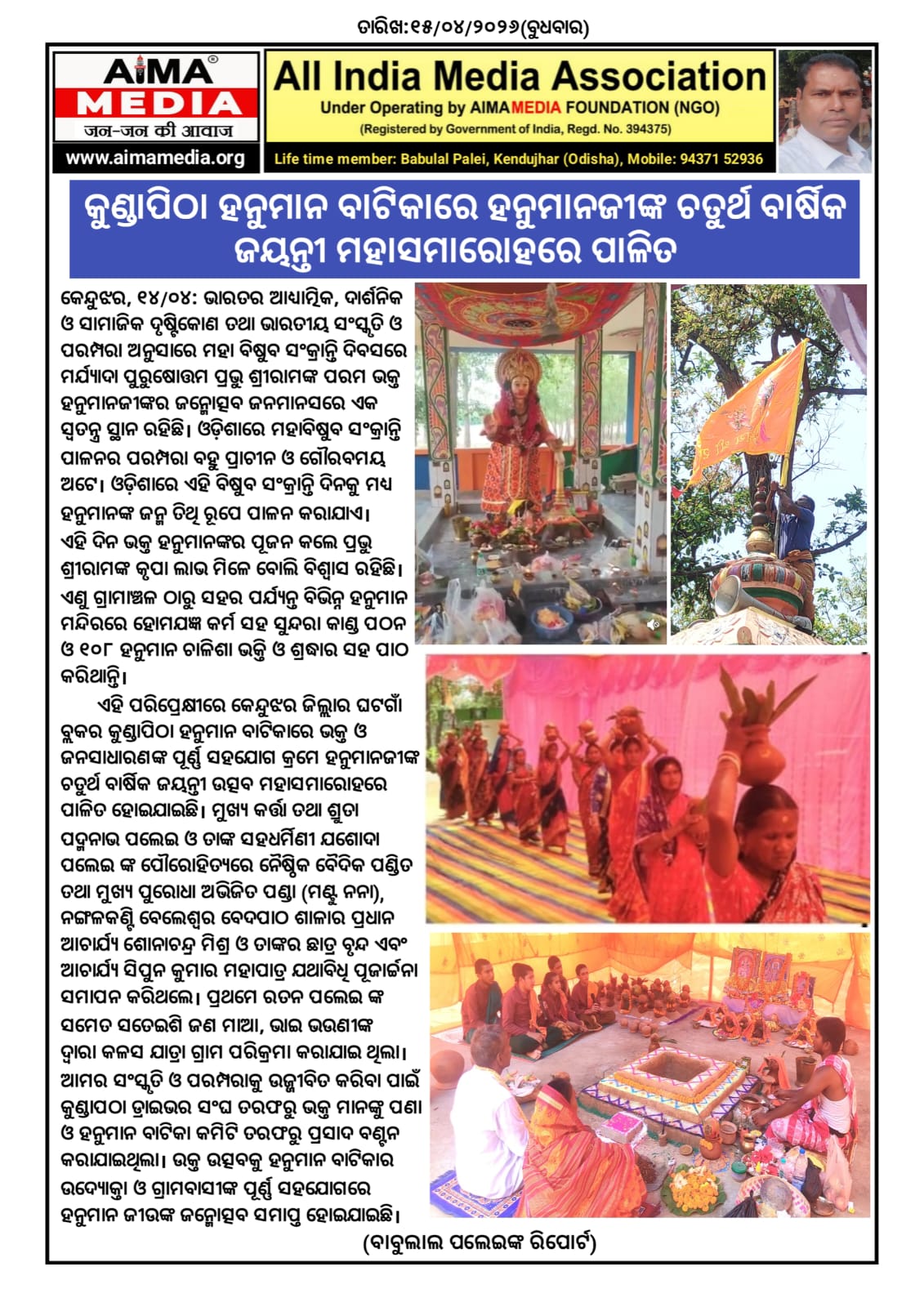 ଏହି ପରିପ୍ରେକ୍ଷୀରେ କେନ୍ଦୁଝର ଜିଲ୍ଲାର ଘଟଗାଁ ବ୍ଲକର କୁଣ୍ଡାପିଠା ହନୁମାନ ବାଟିକାରେ ଭକ୍ତ ଓ ଜନସାଧାରଣଙ୍କ ପୂର୍ଣ୍ଣ ସହଯୋଗ କ୍ରମେ ହନୁମାନଜୀଙ୍କ ଚତୁର୍ଥ ବାର୍ଷିକ ଜୟନ୍ତୀ ଉତ୍ସବ ମହାସମାରୋହରେ ପାଳିତ ହୋଇଯାଇଛି। ମୁଖ୍ୟ କର୍ତ୍ତା ତଥା ଶ୍ରୁତା ପଦ୍ମନାଭ ପଲେଇ ଓ ତାଙ୍କ ସହଧର୍ମିଣୀ ଯଶୋଦା ପଲେଇ ଙ୍କ ପୌରୋହିତ୍ଯରେ ନୈଷ୍ଠିକ ବୈଦିକ ପଣ୍ଡିତ ତଥା ମୁଖ୍ୟ ପୁରୋଧା ଅଭିଜିତ ପଣ୍ଡା ( ମଣ୍ଟୁ ନନା ) , ନଙ୍ଗଳକଣ୍ଟି ବେଲେଶ୍ୱର ବେଦପାଠ ଶାଳାର ପ୍ରଧାନ ଆଚାର୍ଯ୍ୟ ଶୋନାଚନ୍ଦ୍ର ମିଶ୍ର ଓ ତାଙ୍କର ଛାତ୍ର ବୃନ୍ଦ ଏବଂ ଆଚାର୍ଯ୍ୟ ସିପୁନ କୁମାର ମହାପାତ୍ର ଯଥାବିଧି ପୂଜାର୍ଚ୍ଚନା ସମାପନ କରିଥଲେ । ପ୍ରଥମେ ରତନ ପଲେଇ ଙ୍କ ସମେତ ସତେଇଶି ଜଣ ମାଆ, ଭାଇ ଭଉଣୀଙ୍କ ଦ୍ବାରା କଳସ ଯାତ୍ରା ଗ୍ରାମ ପରିକ୍ରମା କରାଯାଇ ଥିଲା।ଆମର ସଂସ୍କୃତି ଓ ପରମ୍ପରାକୁ ଉଜ୍ଜୀବିତ କରିବା ପାଇଁ କୁଣ୍ଡାପଠା ଡ୍ରାଇଭର ସଂଘ ତରଫରୁ ଭକ୍ତ ମାନଙ୍କୁ ପଣା ଓ ହନୁମାନ ବାଟିକା କମିଟି ତରଫରୁ ପ୍ରସାଦ ବଣ୍ଟନ କରାଯାଇଥିଲା। ଉକ୍ତ ଉତ୍ସବକୁ ହନୁମାନ ବାଟିକାର ଉଦ୍ୟୋକ୍ତା ଓ ଗ୍ରାମବାସୀଙ୍କ ପୂର୍ଣ୍ଣ ସହଯୋଗରେ ହନୁମାନ ଜୀଉଙ୍କ ଜନ୍ମୋତ୍ସବ ସମାପ୍ତ ହୋଇଯାଇଛି।